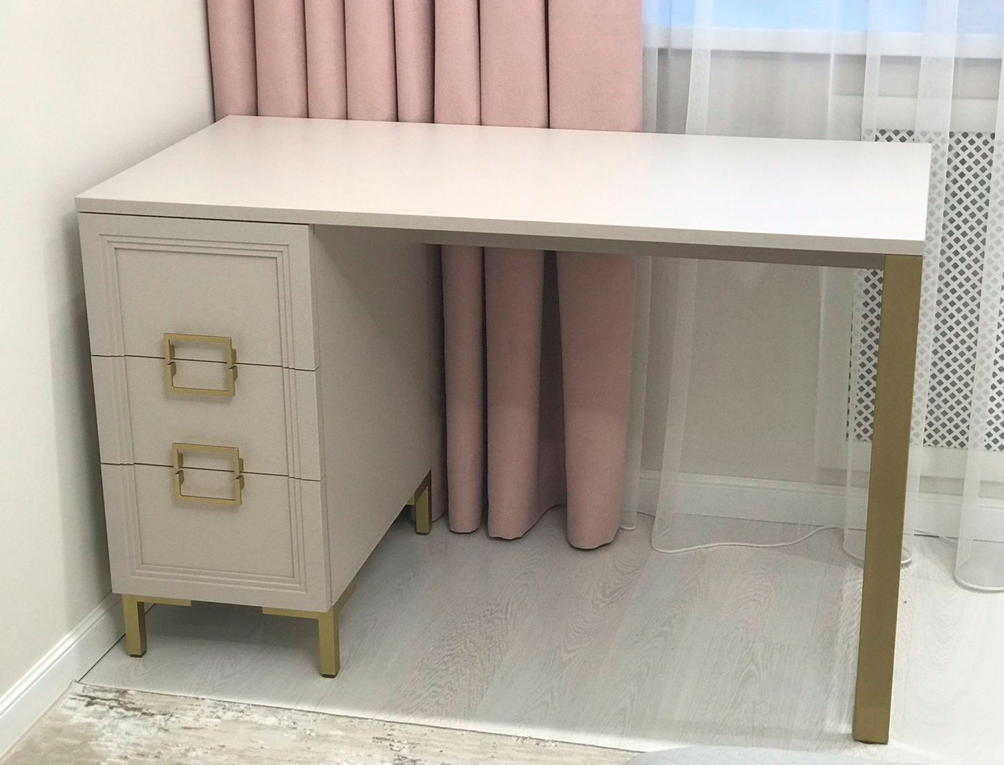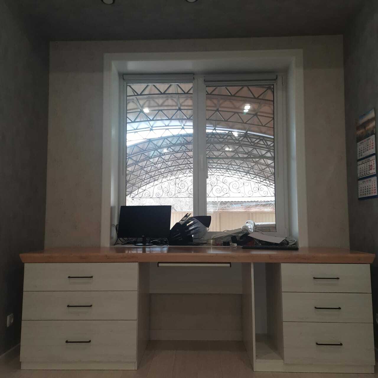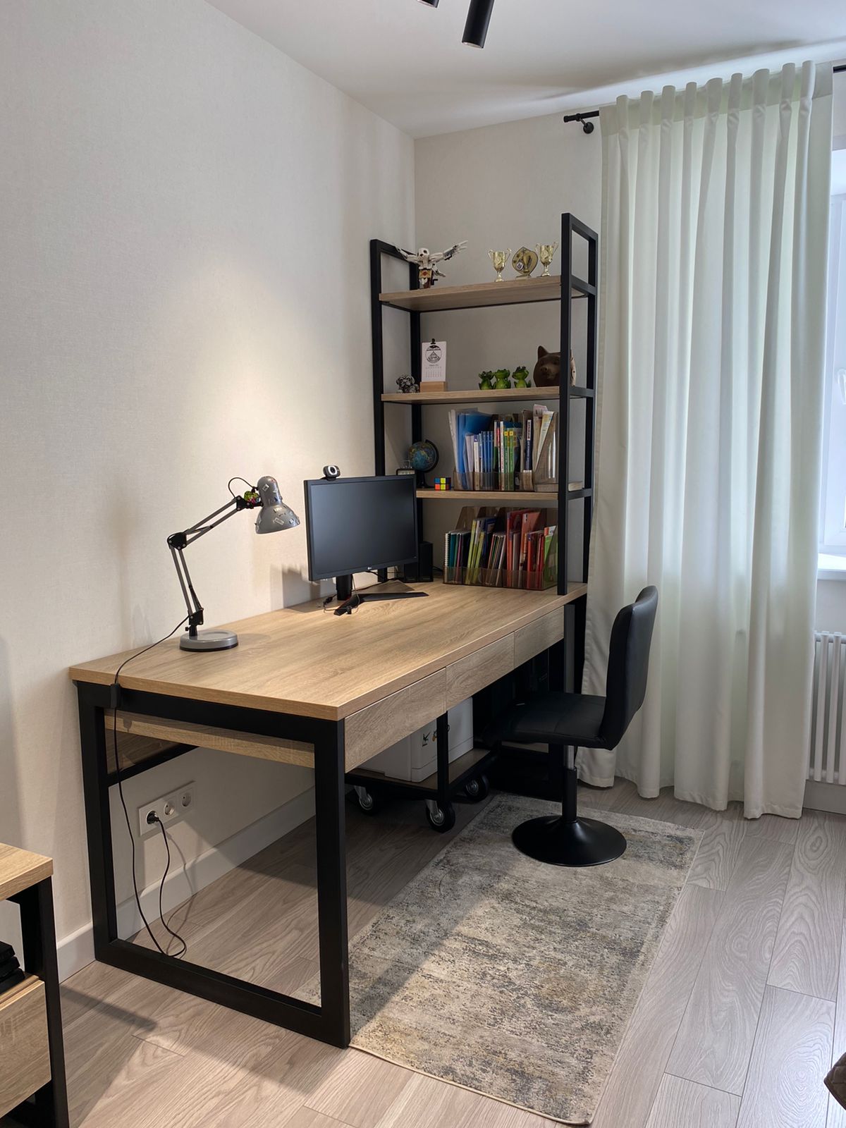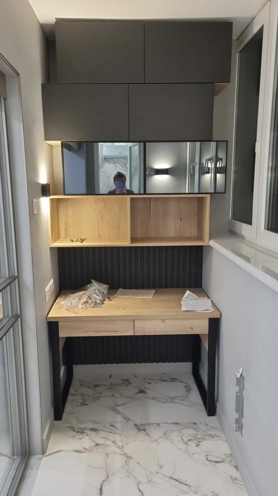 Рабочее место: Организовано на утепленном балконе, объединенном с кухней (стена между ними снесена).