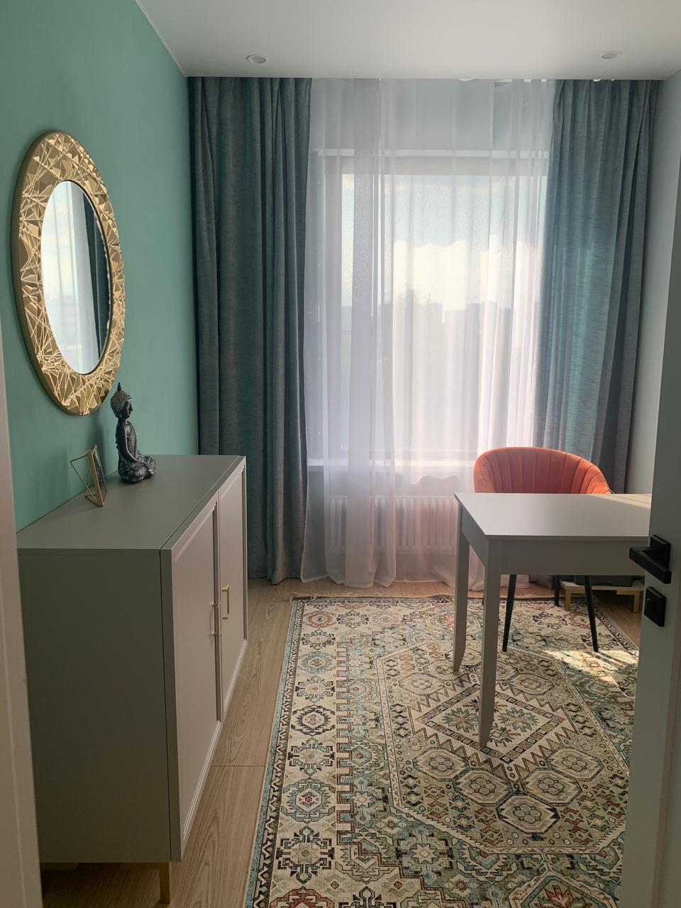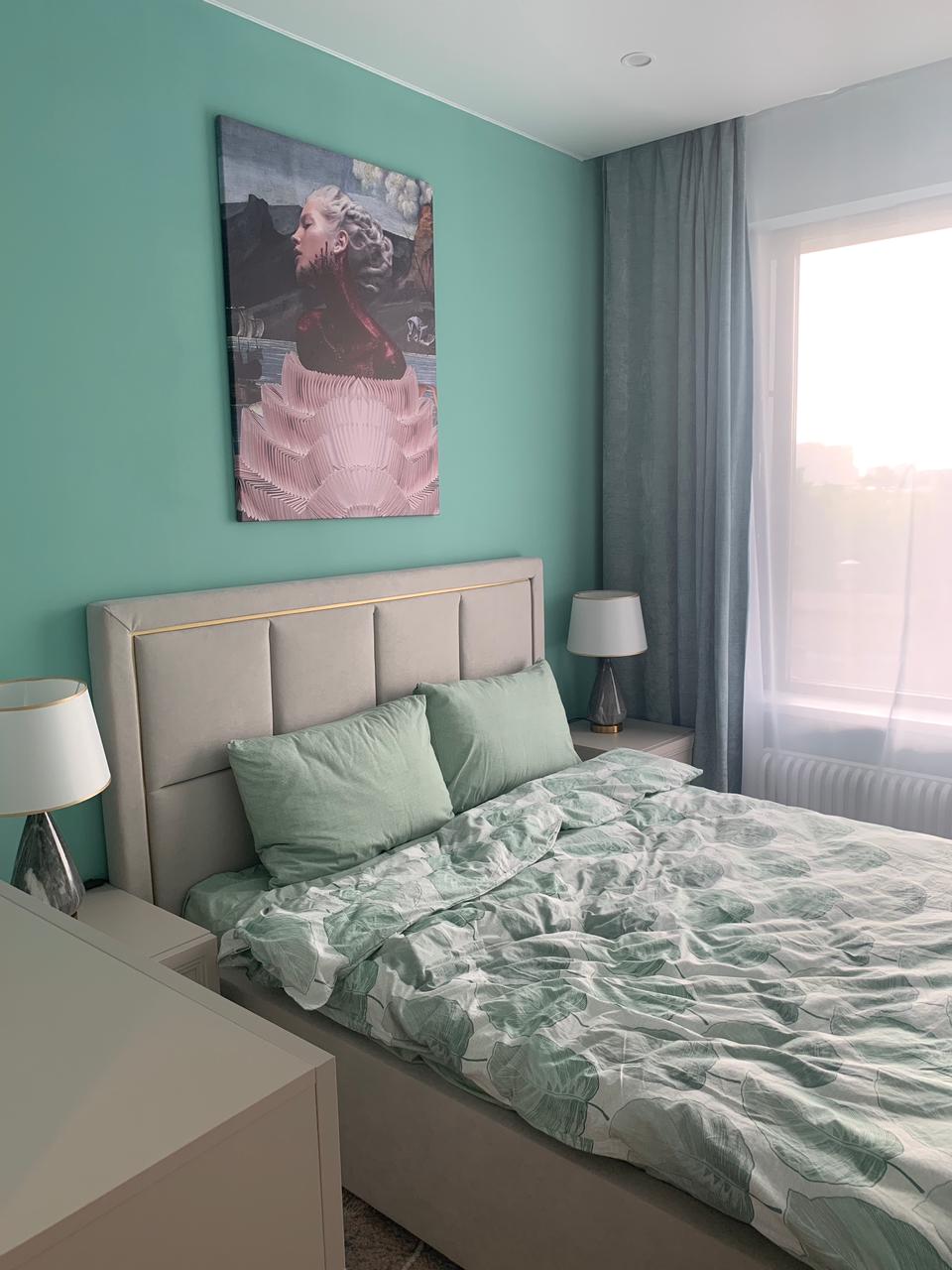 Спальня и кабинет, несмотря на одинаковые белые шкафы, воспринимаются по-разному благодаря различному освещению. Спальня, выходящая во двор, получилась уютной и "брутальной", в то время как кабинет, за счёт солнечного света и сочетания белого и зеленого, – свежим и благородным. Разница в освещении и расположении комнат (спальня – теневая сторона, кабинет – солнечная) создала желаемый эффект. В итоге, спальня приобрела черты уютного будуара, что, по нашему мнению, гармонирует с интересами клиента, увлекающегося литературой.