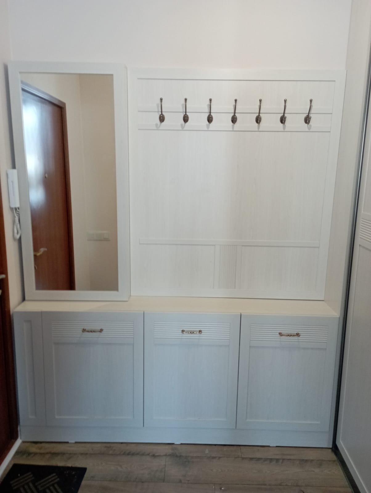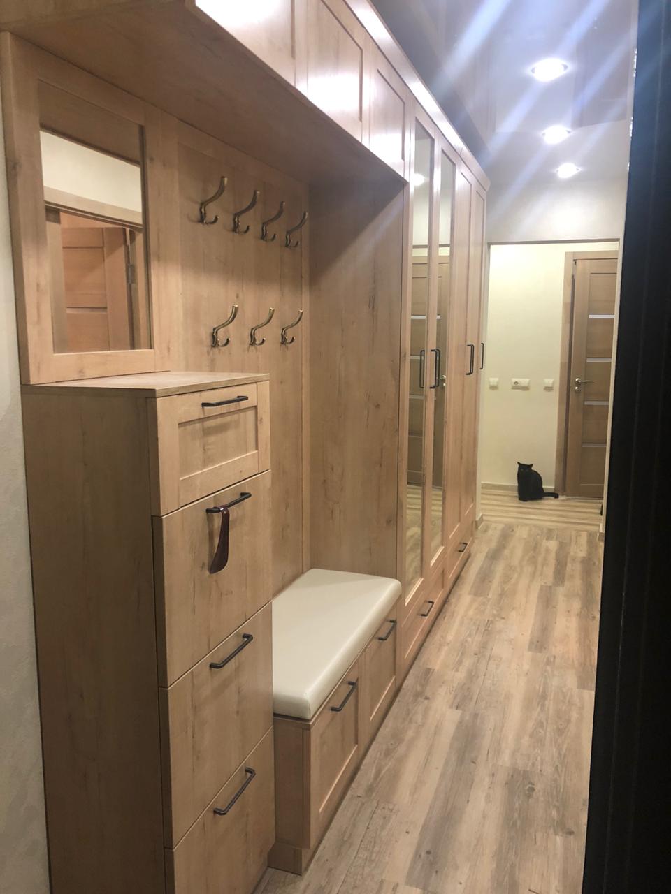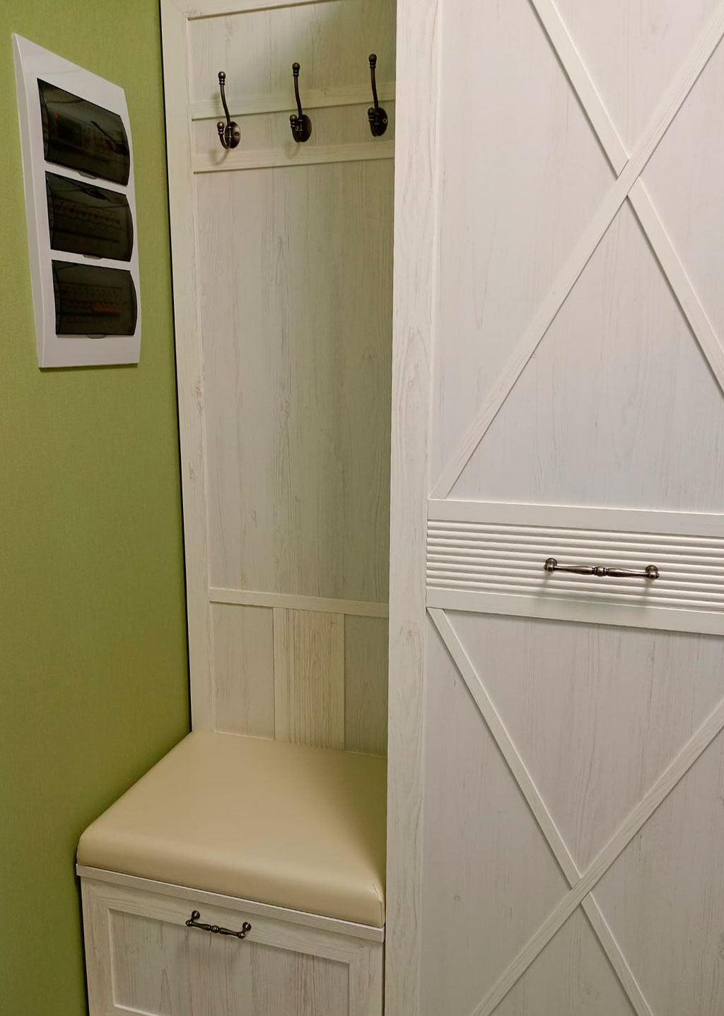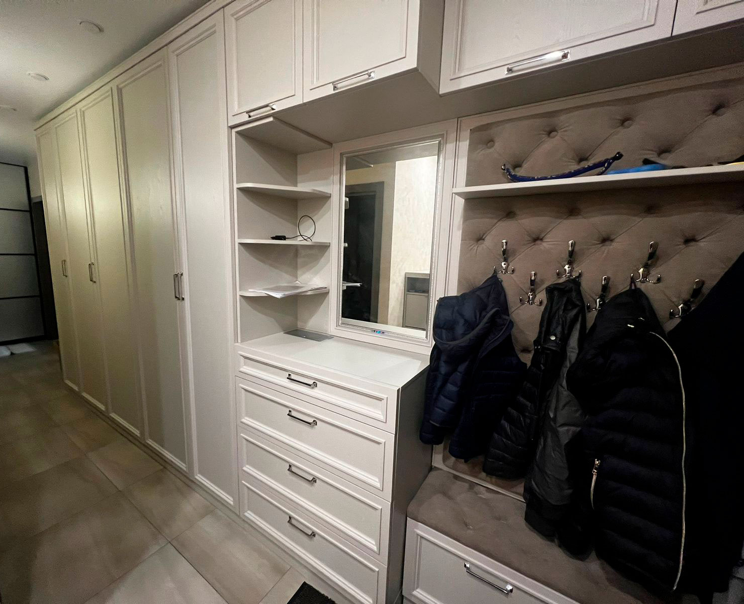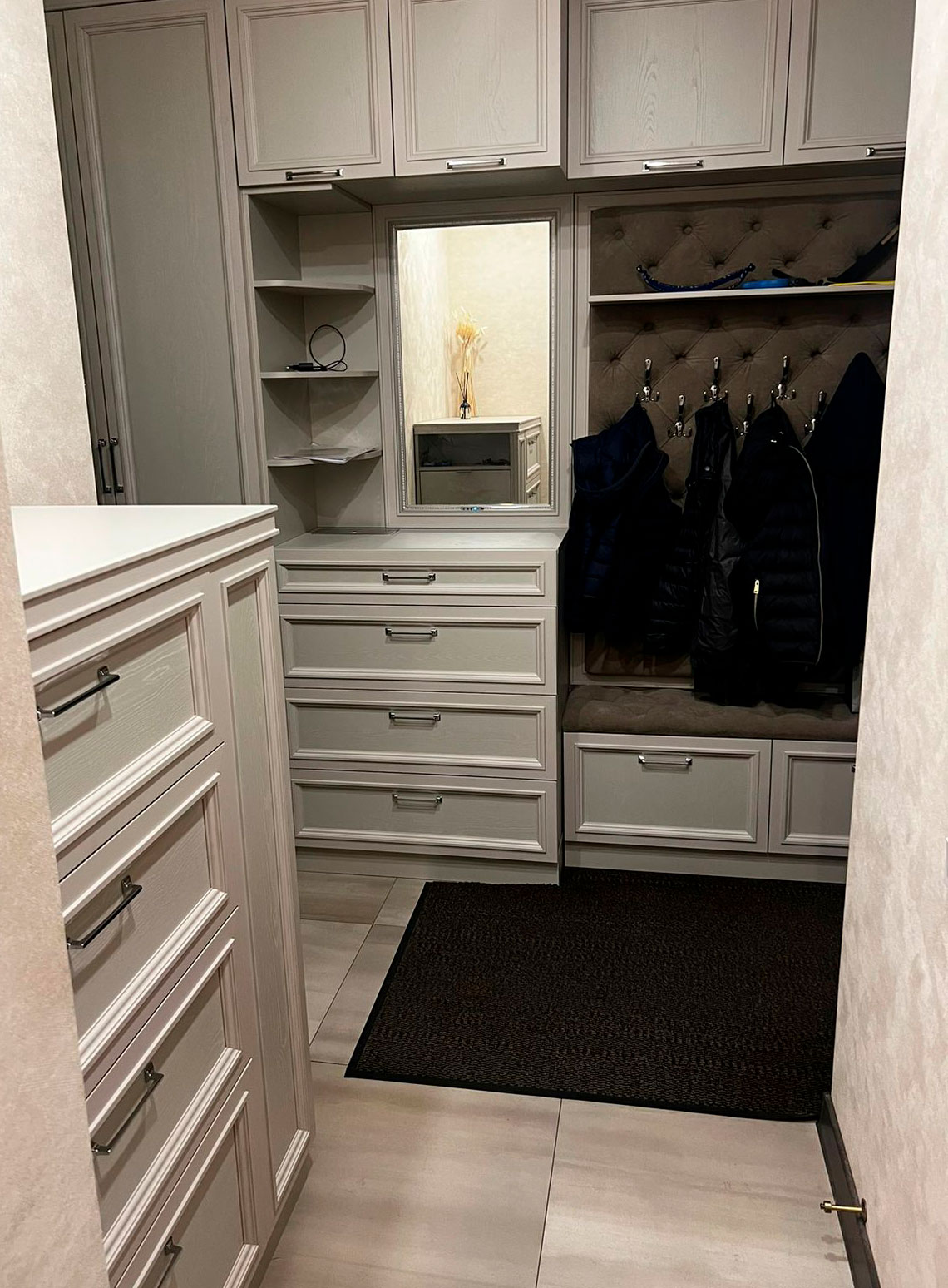Вместе с клиентами мы разработали схемы будущей мебели, определили расположение ящиков, полок и крючков. Также подбирали материалы, цвета и фурнитуру, согласовывали детали, чтобы мебель гармонично вписалась в интерьер. Проводили замеры и проделали огромную работу. Производство осуществлялось на нашей фабрике «Ангстрем». Все было изготовлено в срок, доставлено и собрано до Нового года, что стало приятным сюрпризом для клиентов.