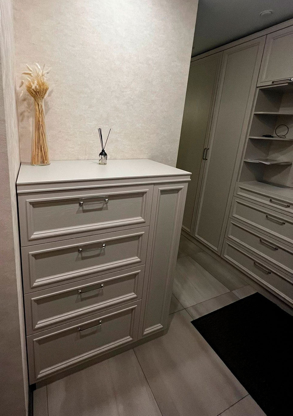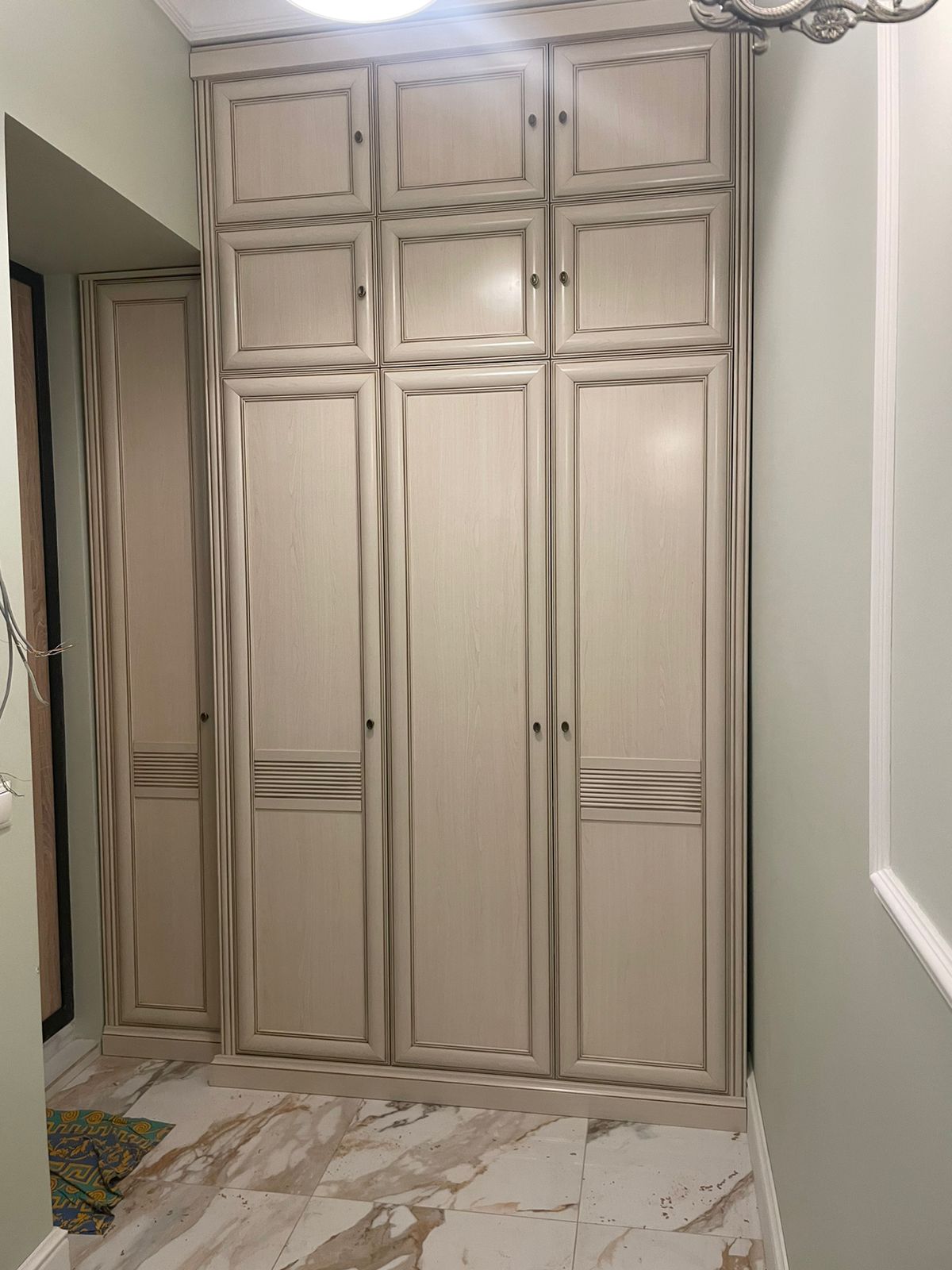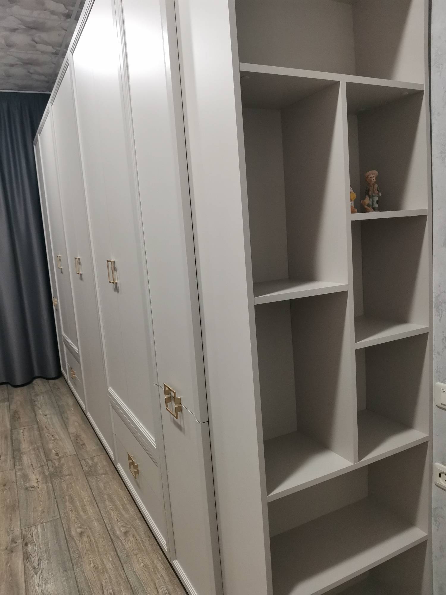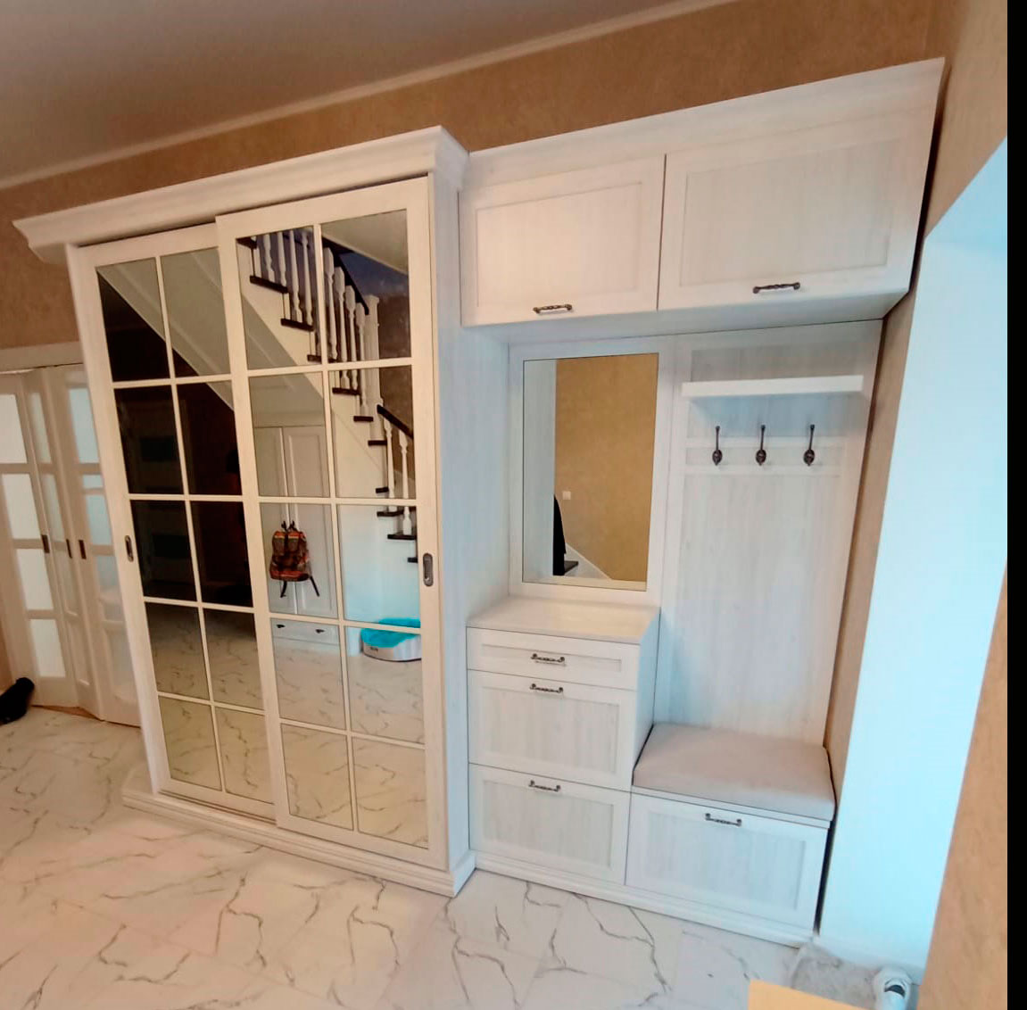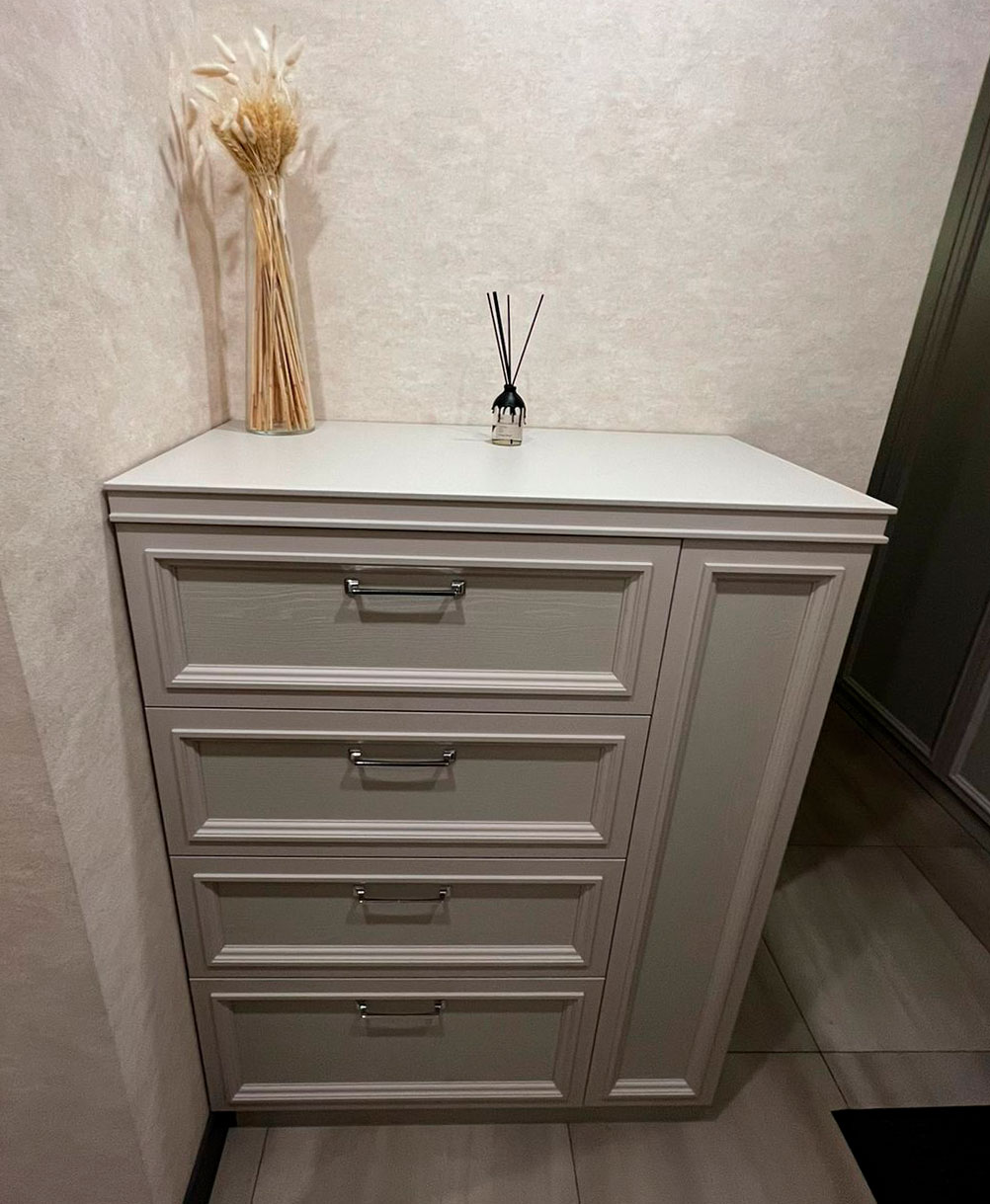 Вместе с клиентами мы разработали схемы будущей мебели, определили расположение ящиков, полок и крючков. Также подбирали материалы, цвета и фурнитуру, согласовывали детали, чтобы мебель гармонично вписалась в интерьер. Проводили замеры и проделали огромную работу. Производство осуществлялось на нашей фабрике «Ангстрем». Все было изготовлено в срок, доставлено и собрано до Нового года, что стало приятным сюрпризом для клиентов.