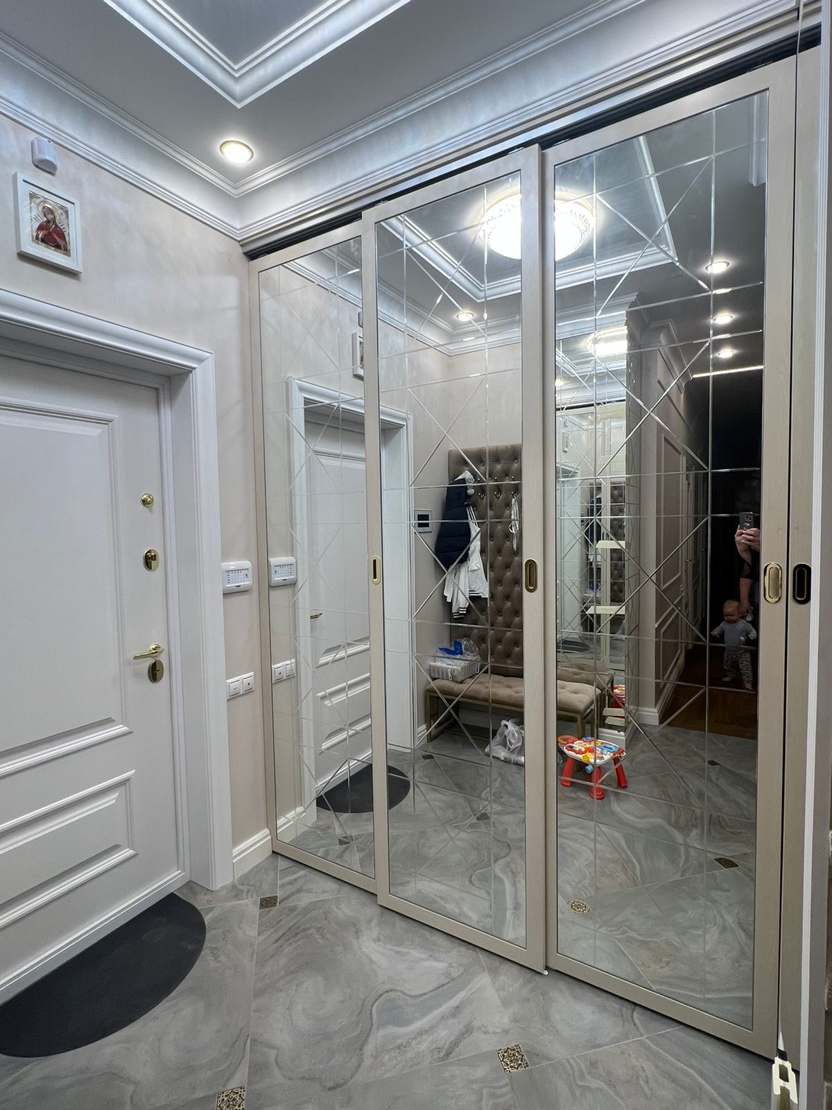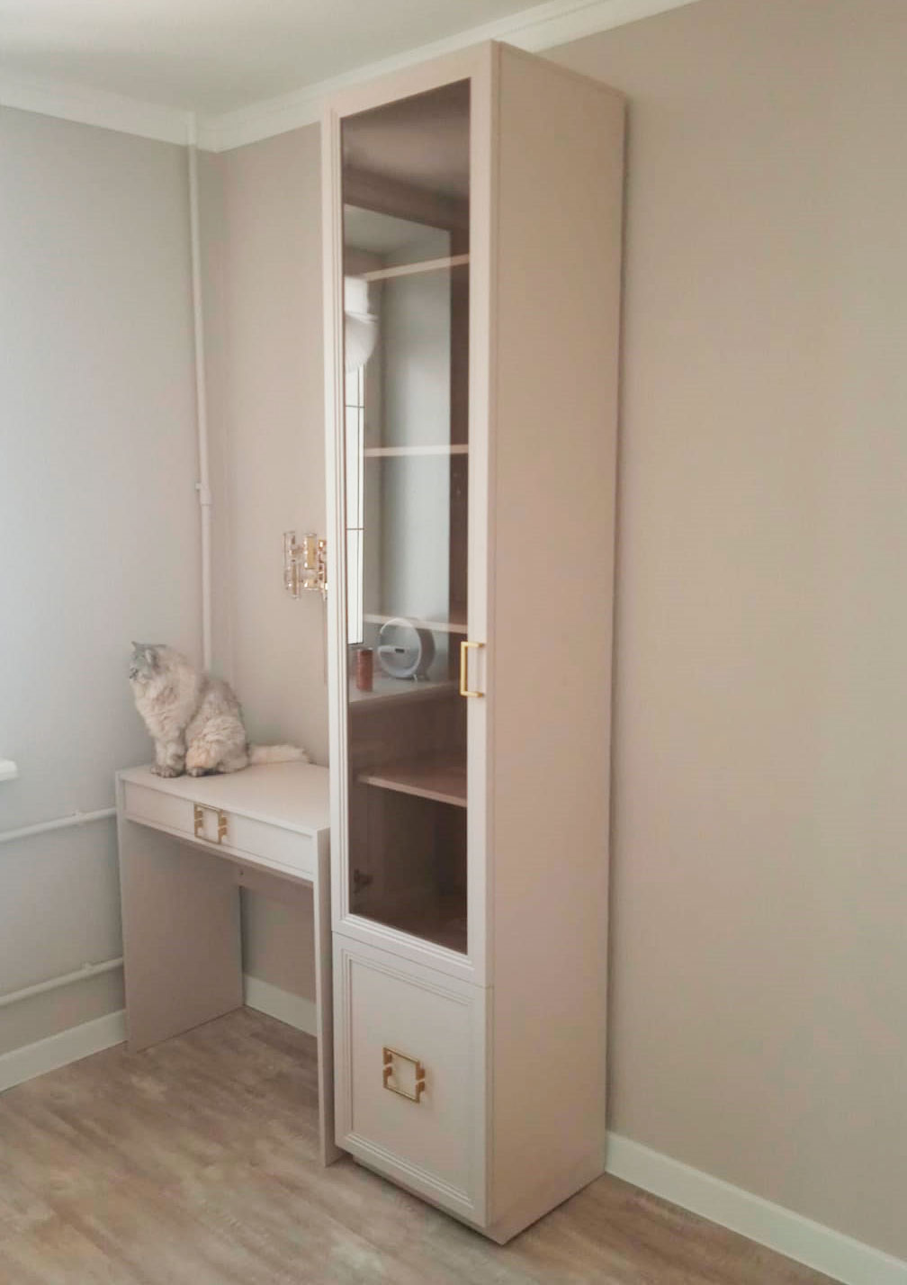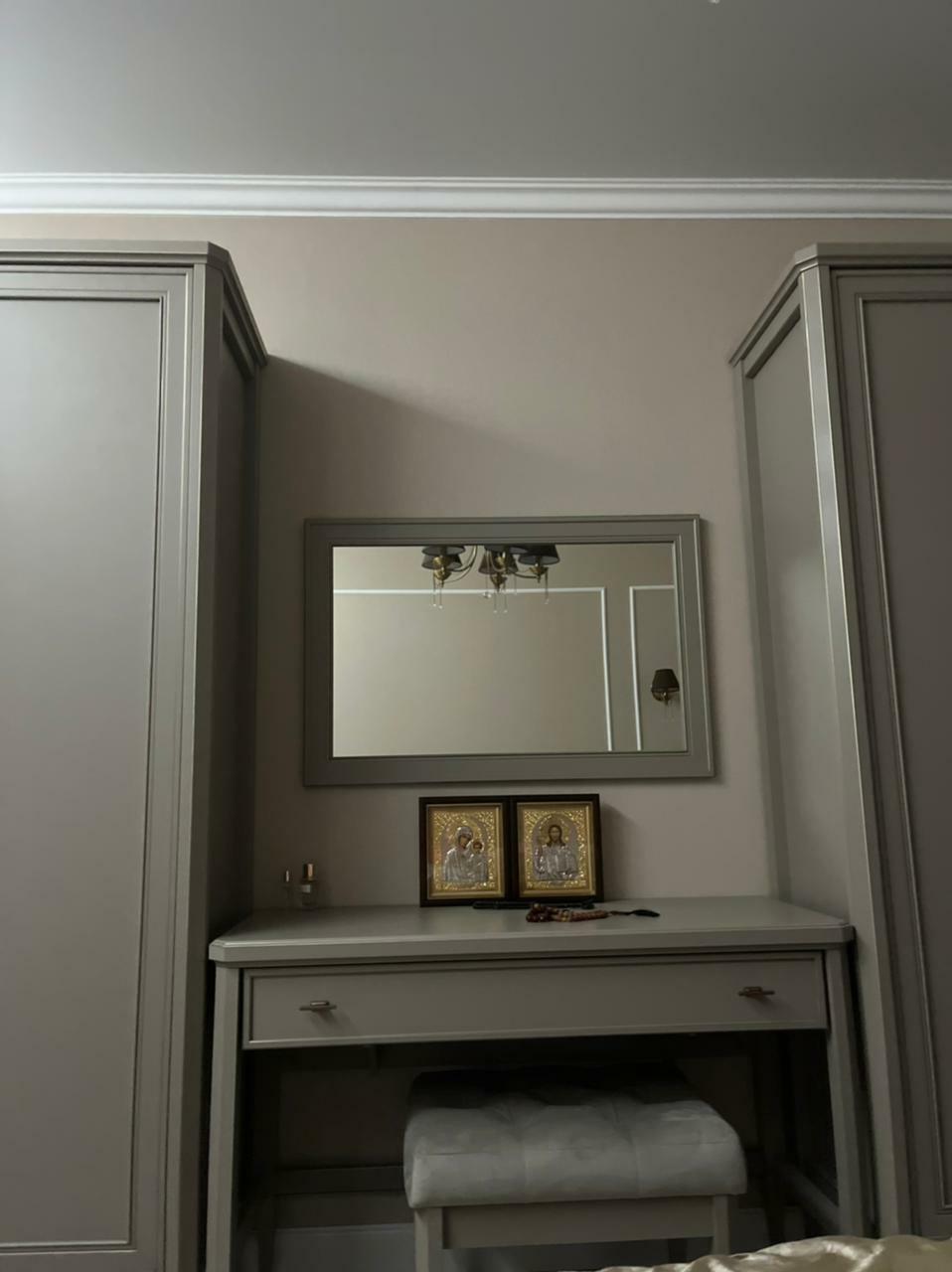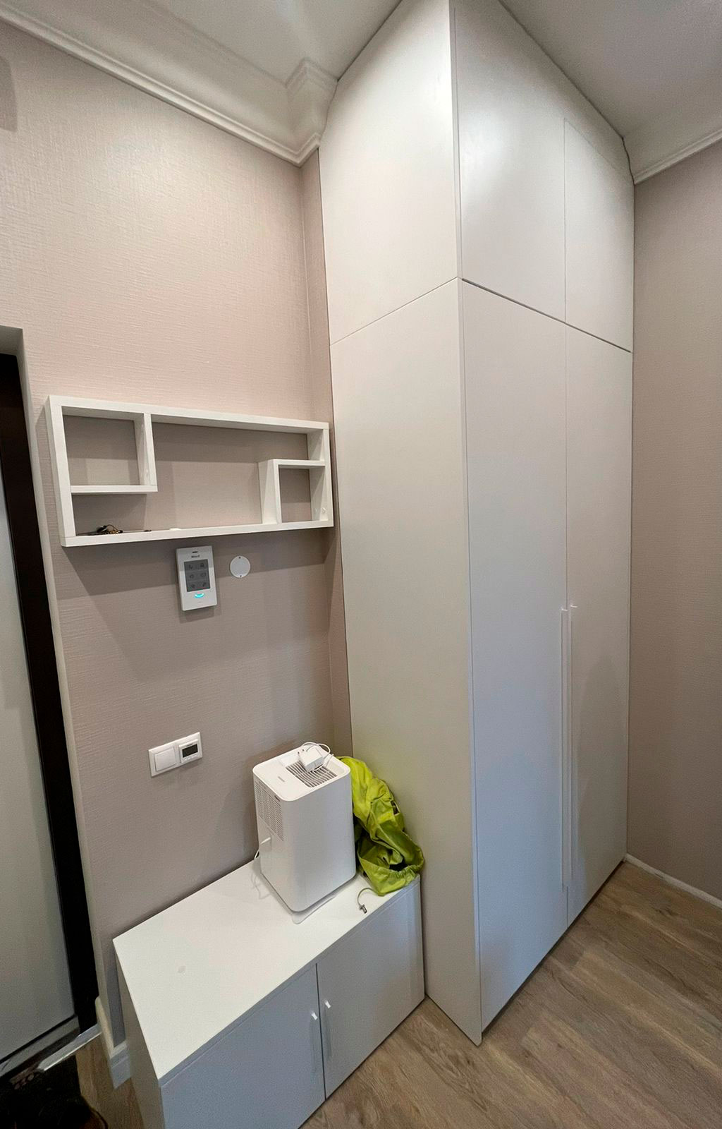 В прихожей, учитывая её узкую форму, мы спроектировали шкаф-купе, дополнив его подвесной консолью с зеркалом для хранения мелочей. Создали также зону для переодевания, отсутствовавшую на момент первого осмотра.