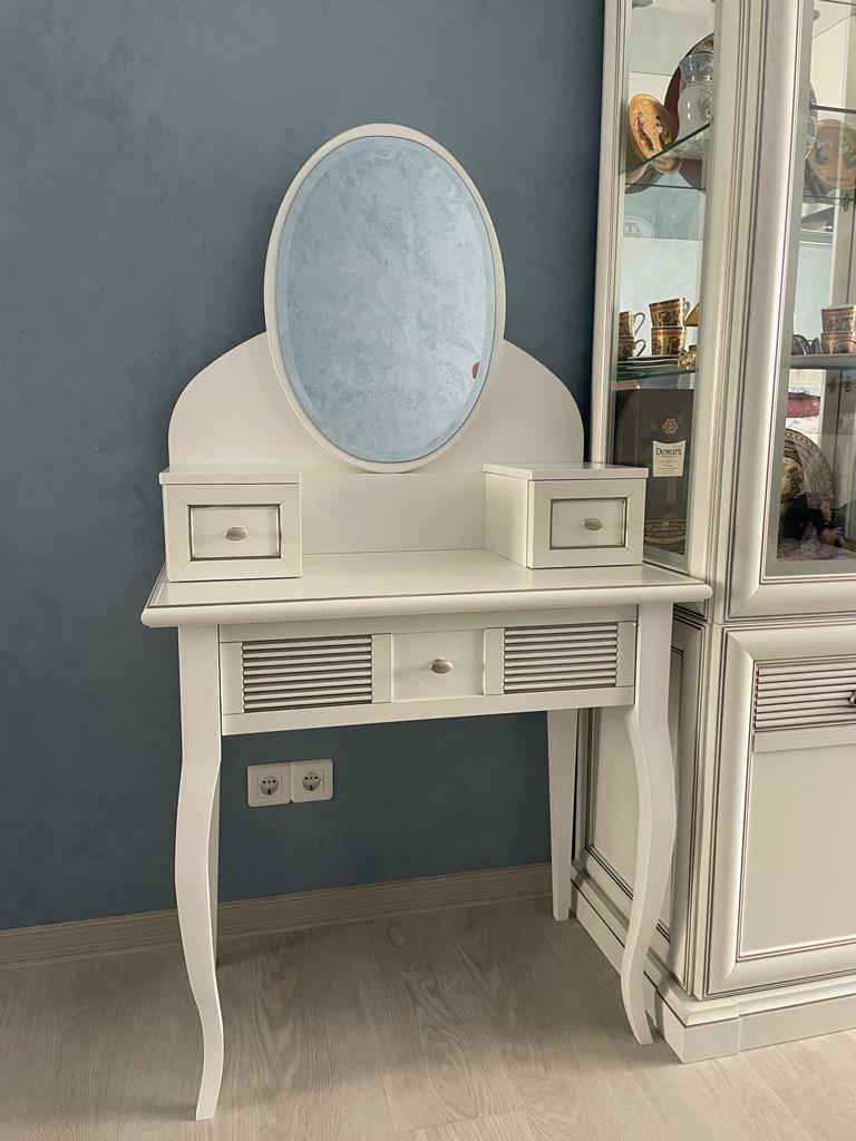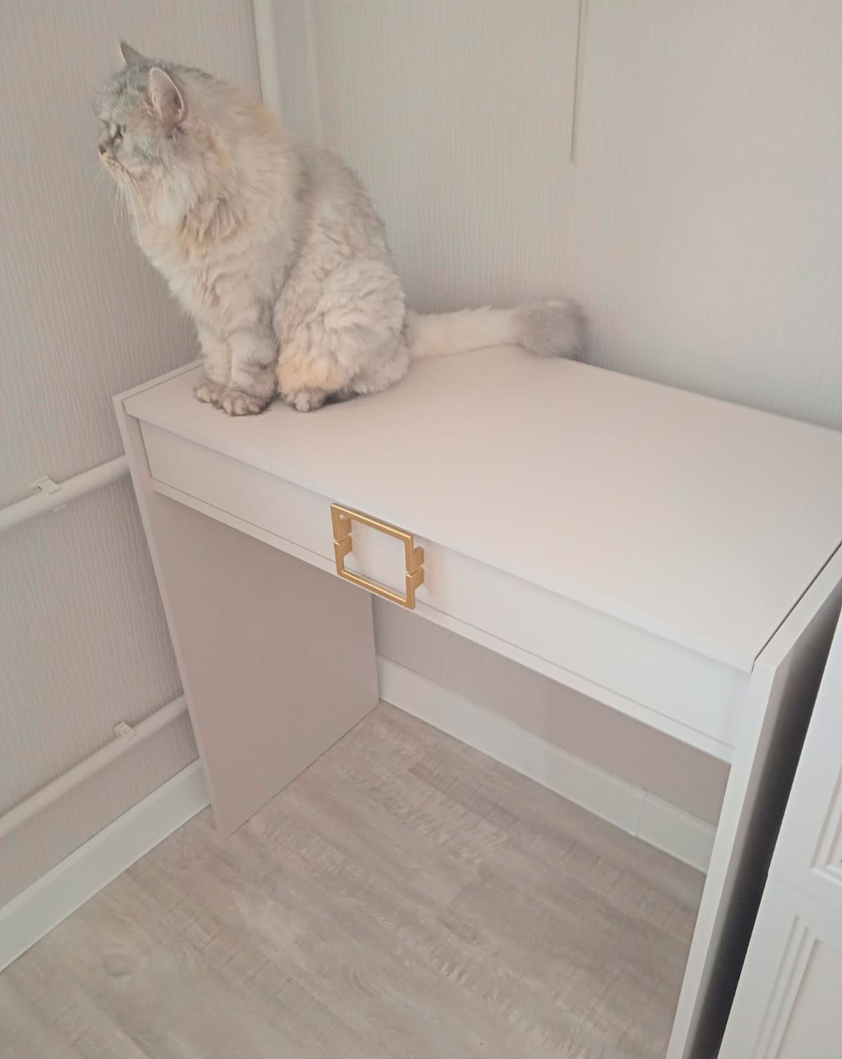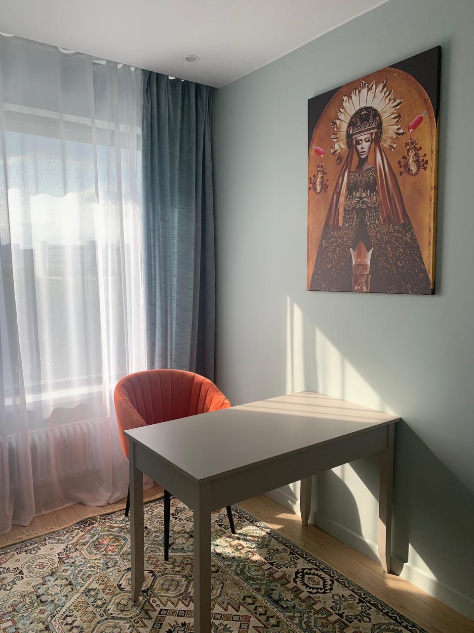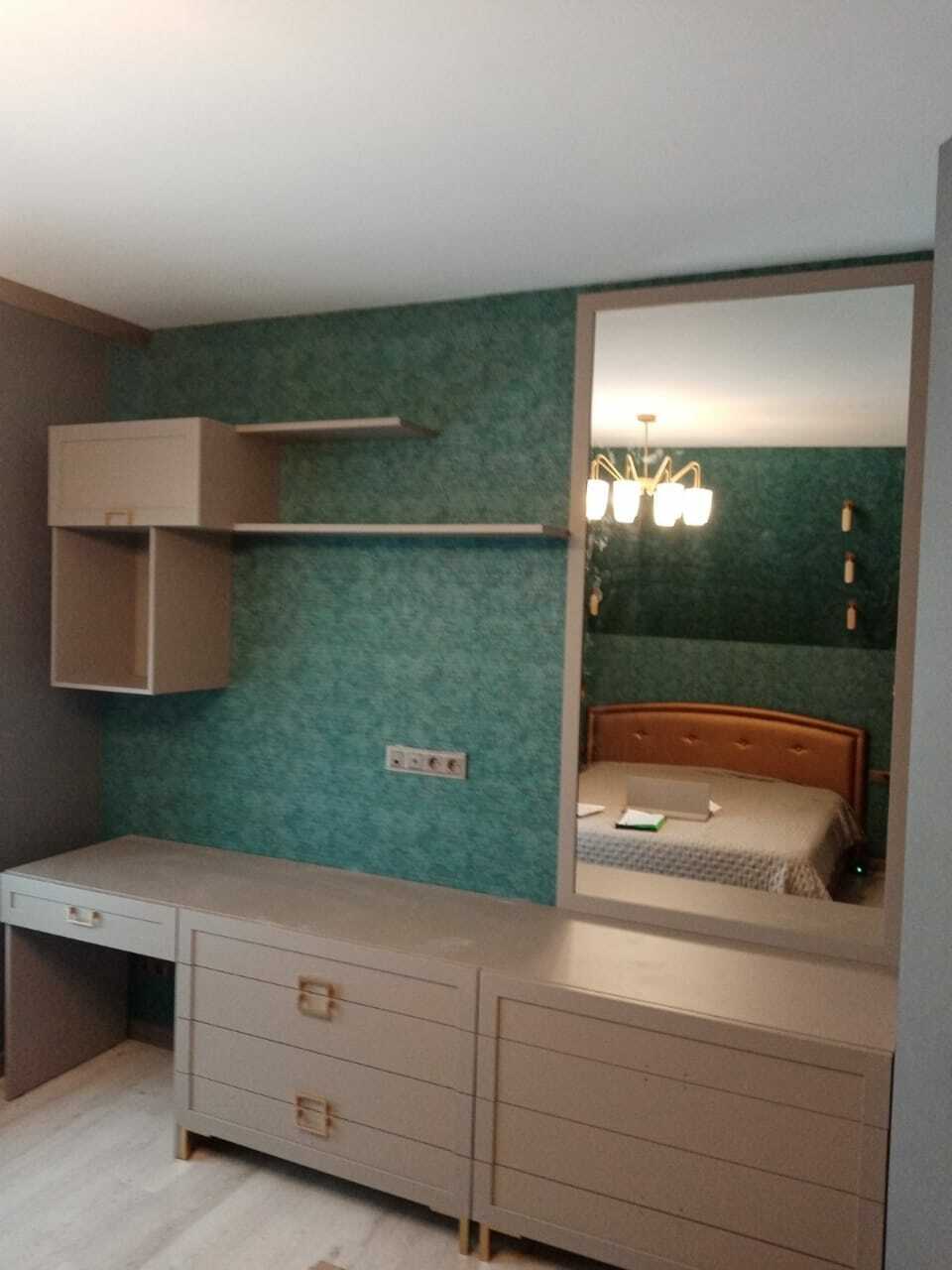 В прихожей, учитывая её узкую форму, мы спроектировали шкаф-купе, дополнив его подвесной консолью с зеркалом для хранения мелочей. Создали также зону для переодевания, отсутствовавшую на момент первого осмотра.
