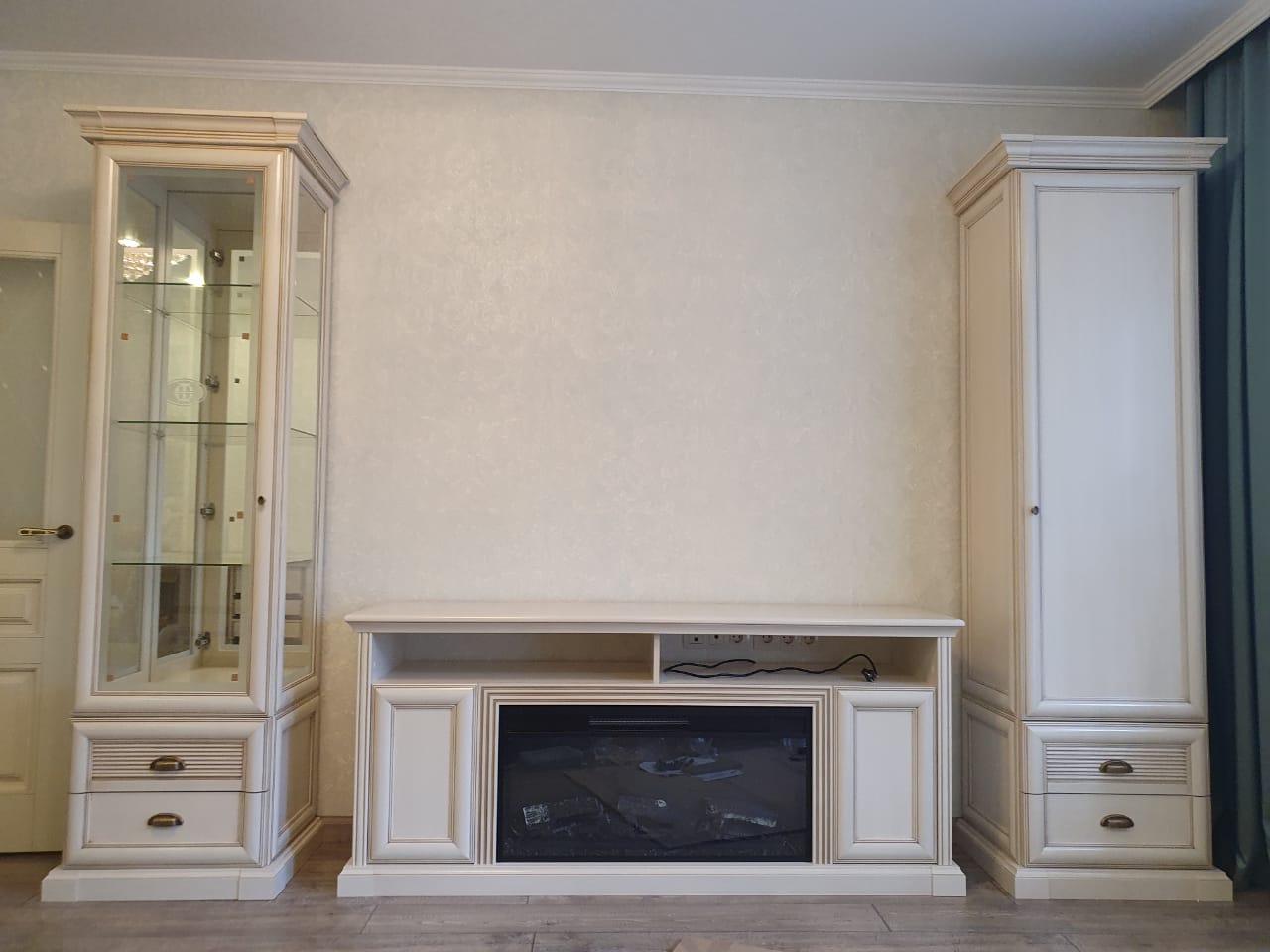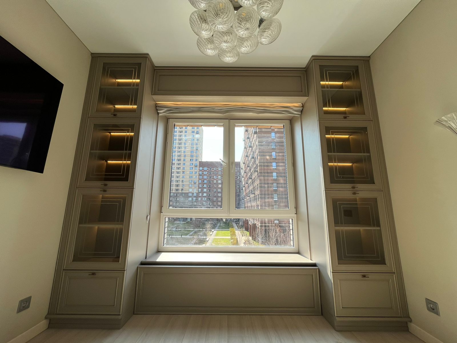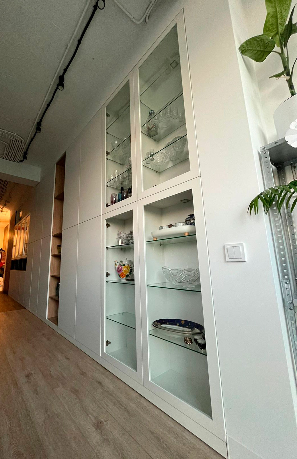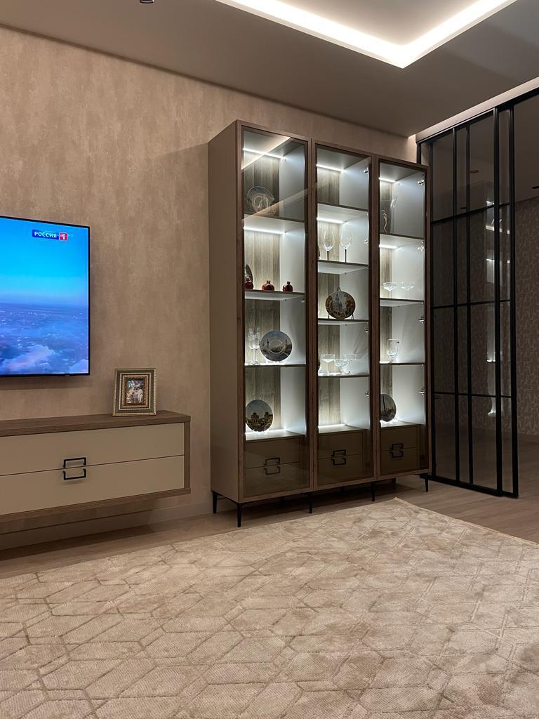 В гостиной, учитывая размеры и стиль, мы разработали витрины с изменяющейся высотой полок, создав иллюзию простора. Для тумбы был выбран фасад-купе, чтобы сохранить визуальную линию с витринами и шкафами. Дизайн учитывал наличие яркой, авангардной посуды и часов клиента.