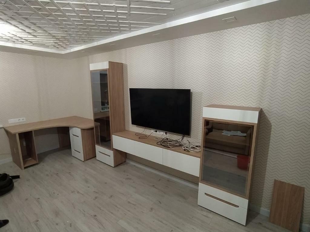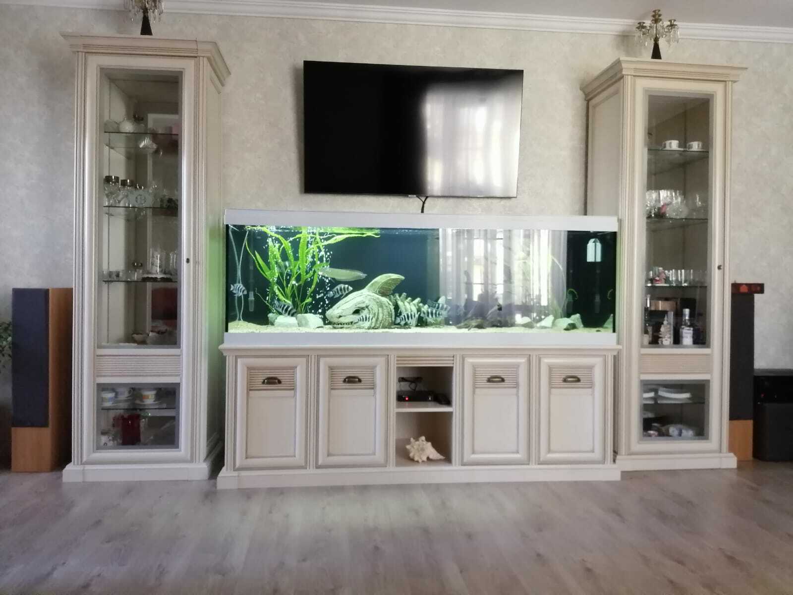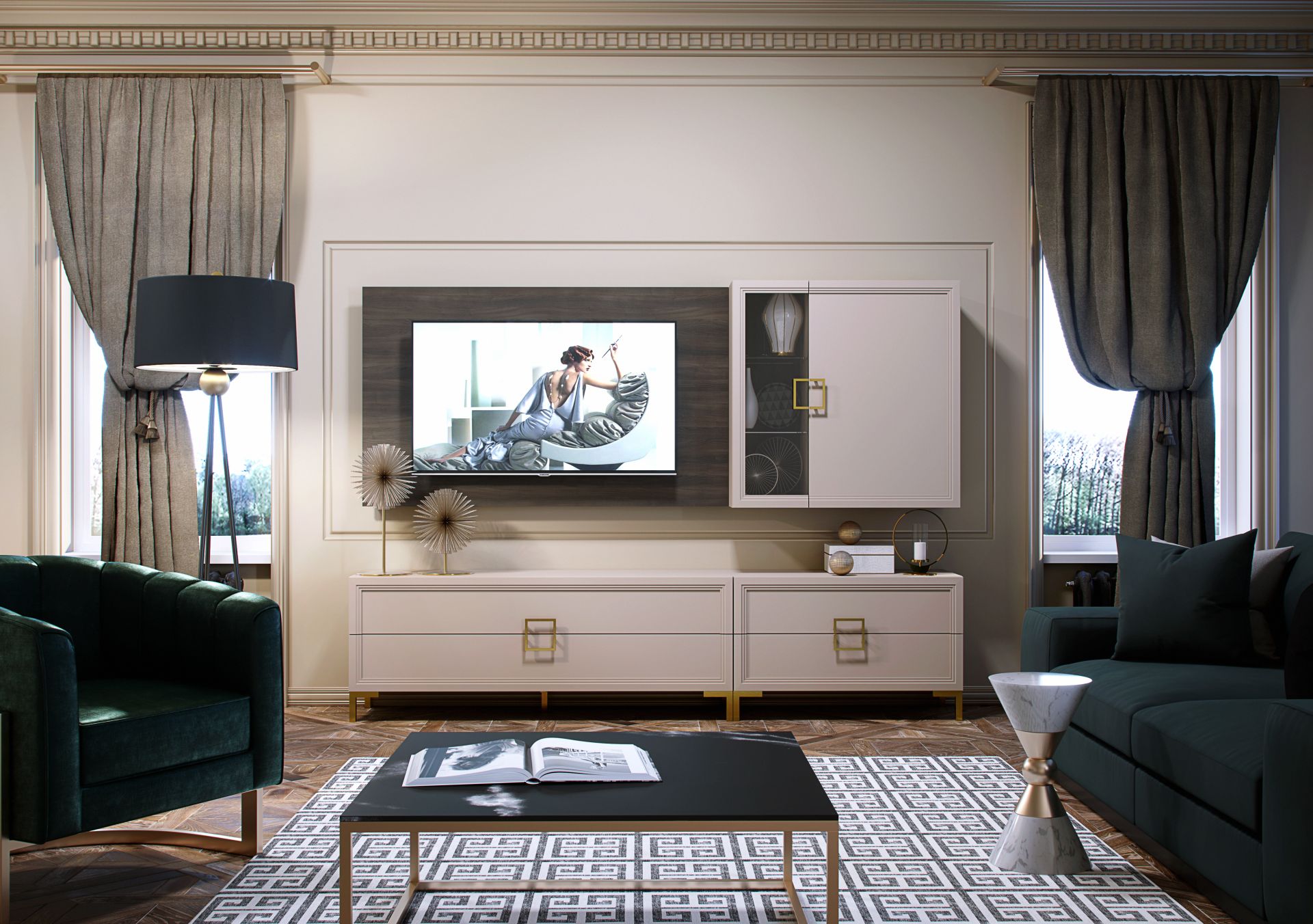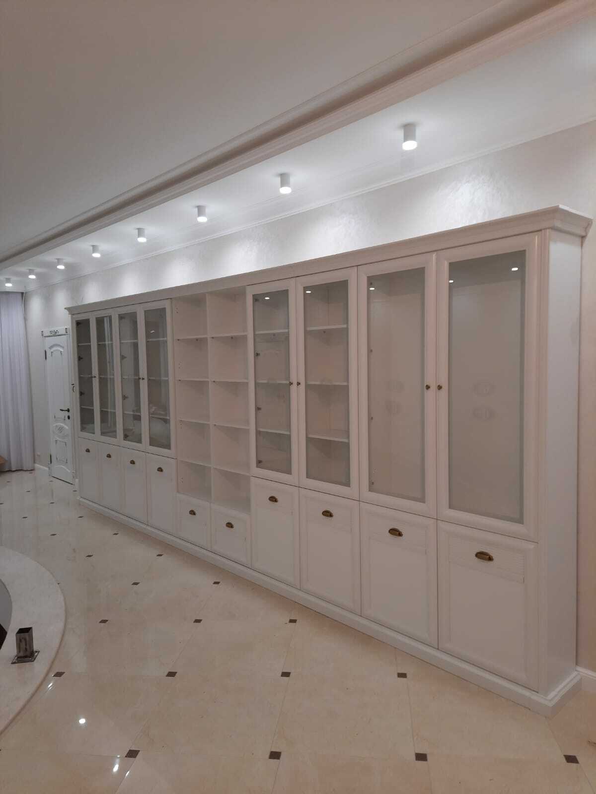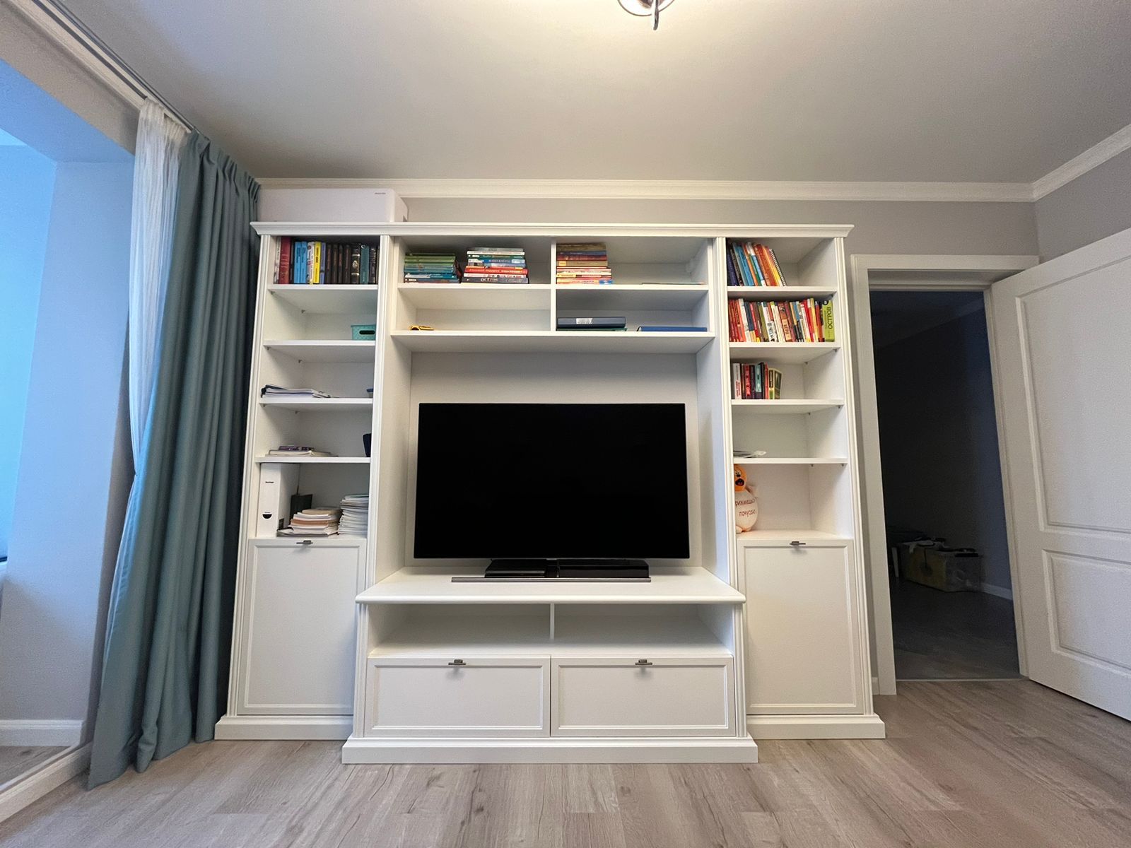В гостиной, учитывая размеры и стиль, мы разработали витрины с изменяющейся высотой полок, создав иллюзию простора. Для тумбы был выбран фасад-купе, чтобы сохранить визуальную линию с витринами и шкафами. Дизайн учитывал наличие яркой, авангардной посуды и часов клиента.