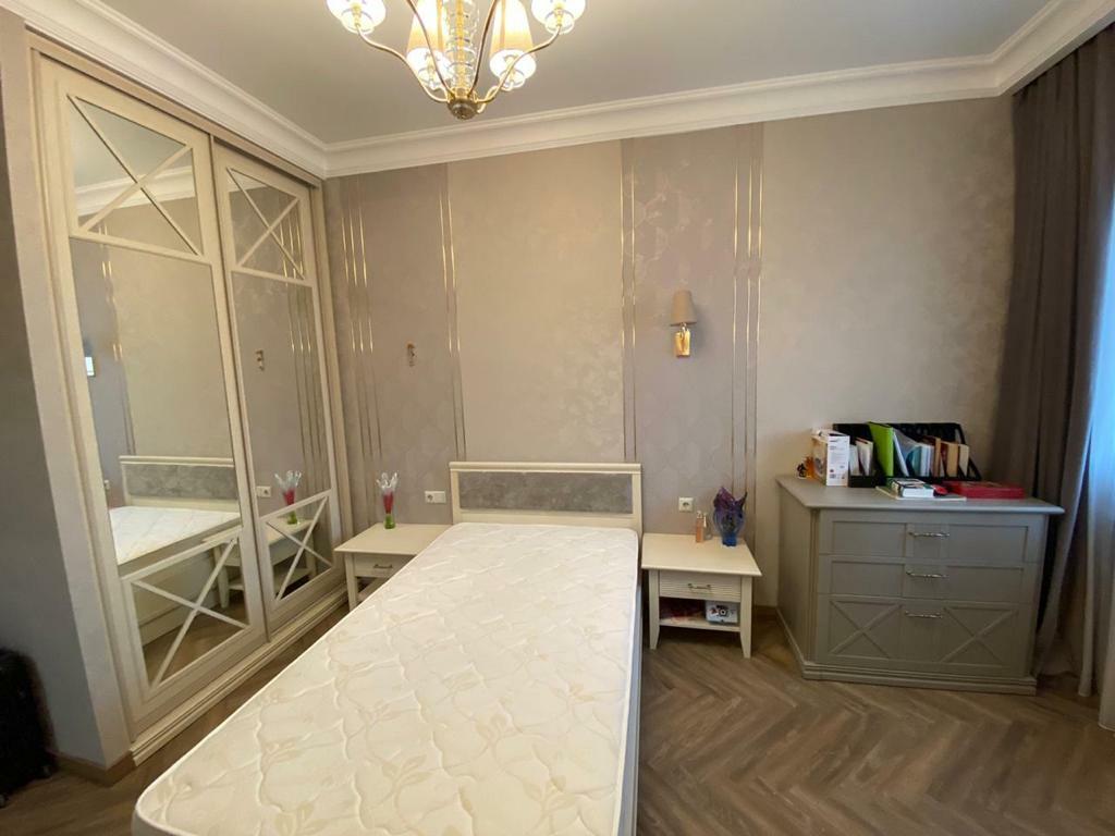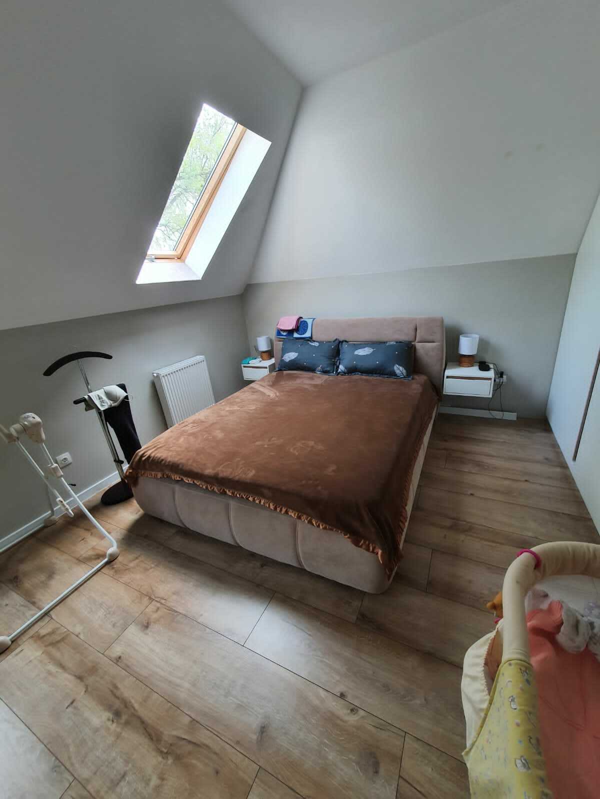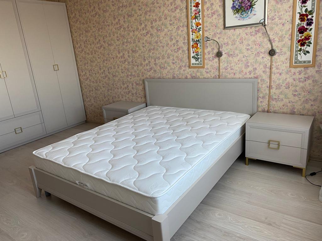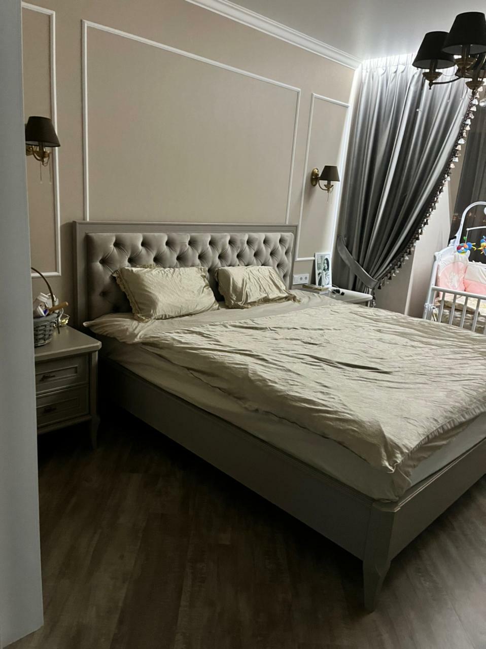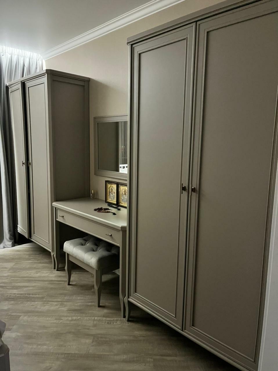 Спальня родителей: Спальня оборудована встроенной гардеробной системой Arista с купе-дверями (фасады – авторская работа с фрезеровкой). В спальне также находится рабочее место со встроенной навесной тумбой под телевизор.