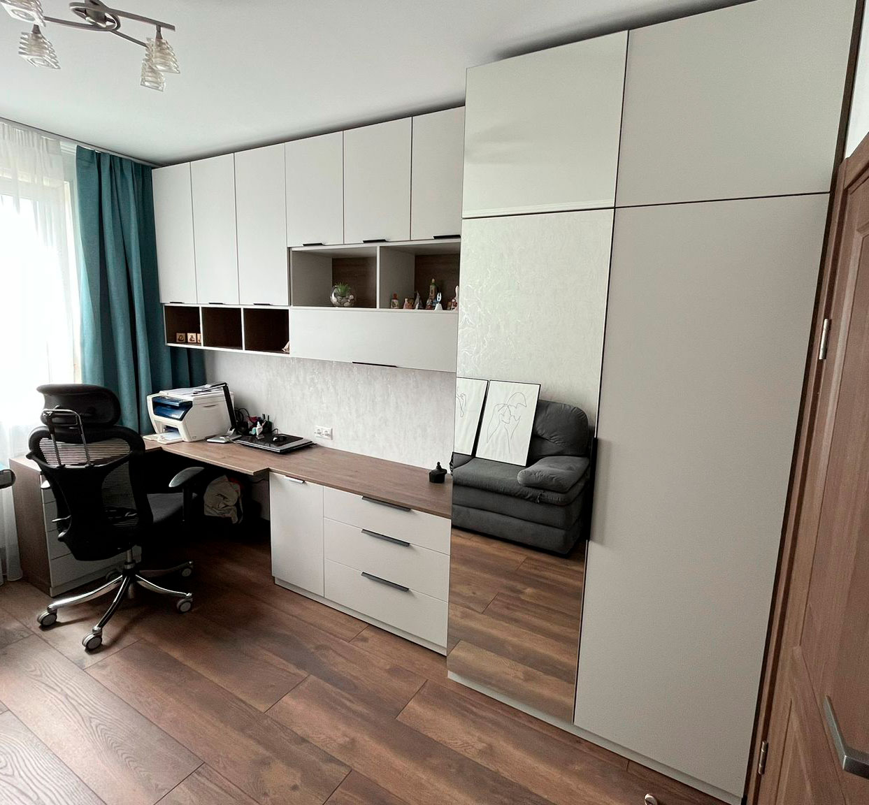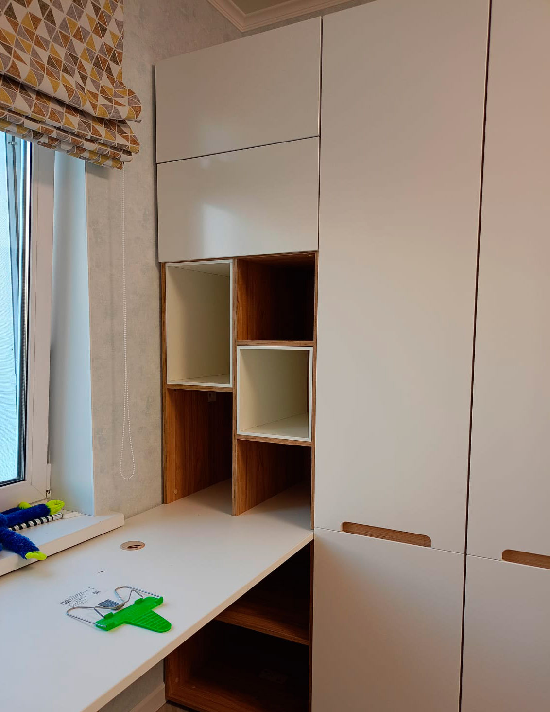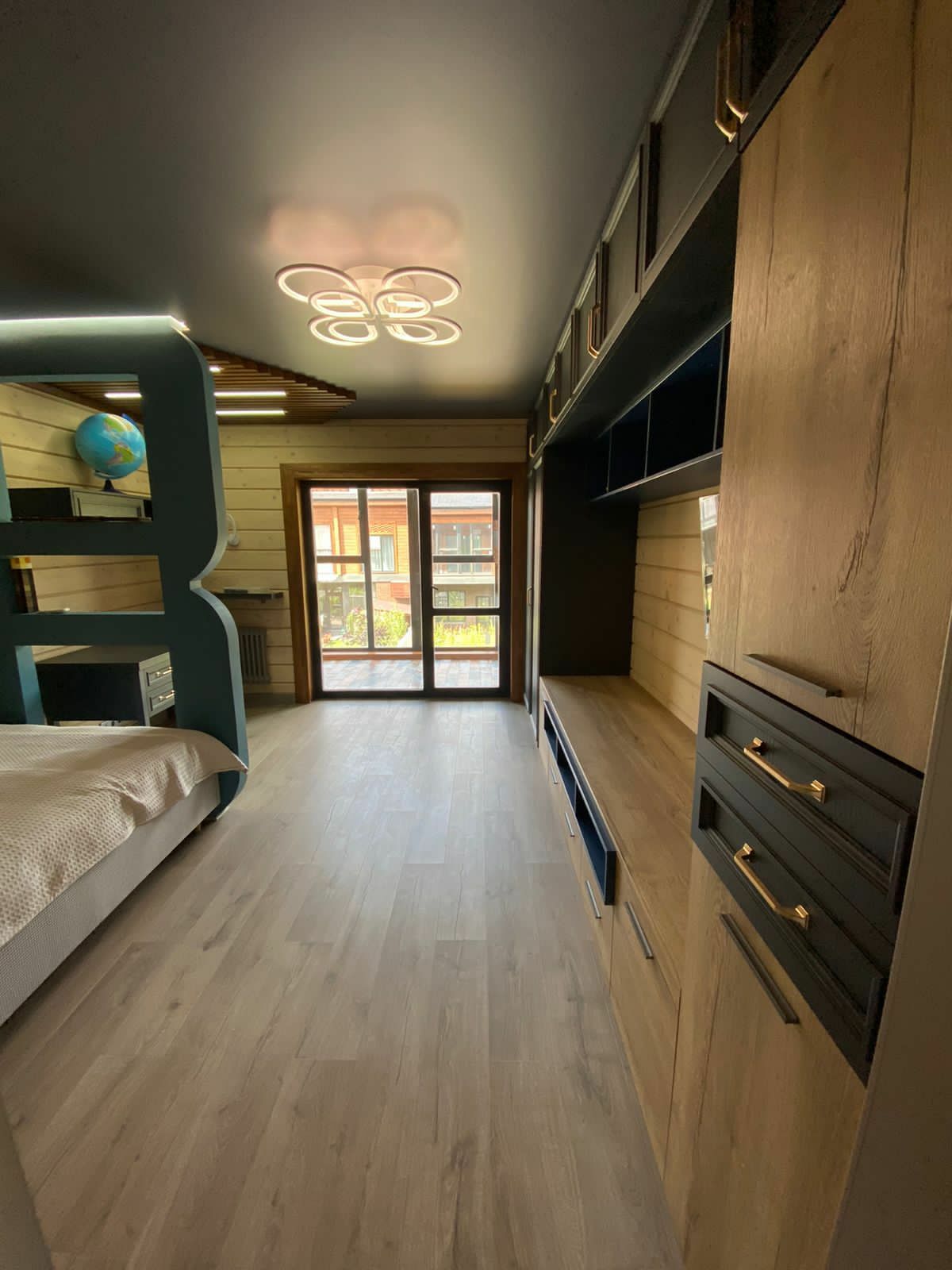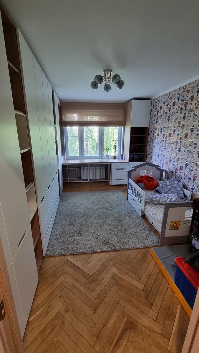 Детская: Одна просторная детская комната с двумя большими шкафами до потолка и встроенным рабочим столом для двоих детей. Шкафы выполнены с эмалевым покрытием глубокого цвета.