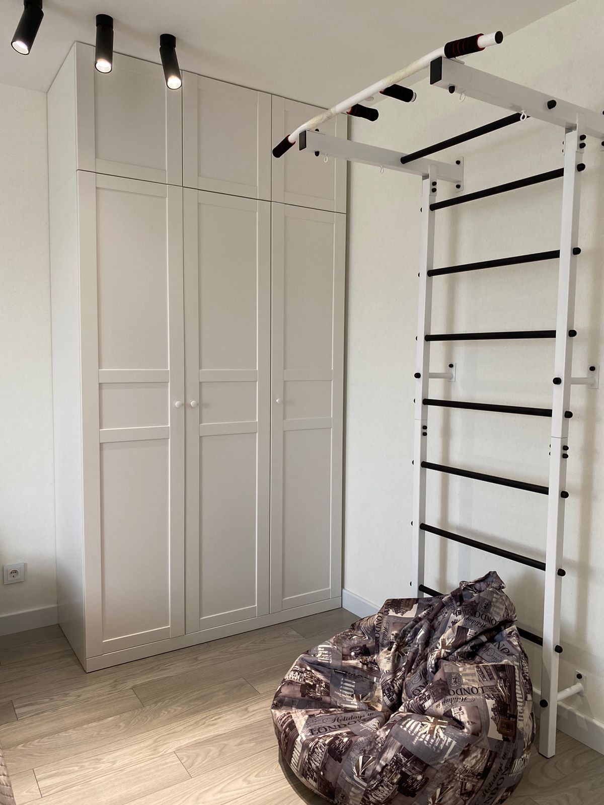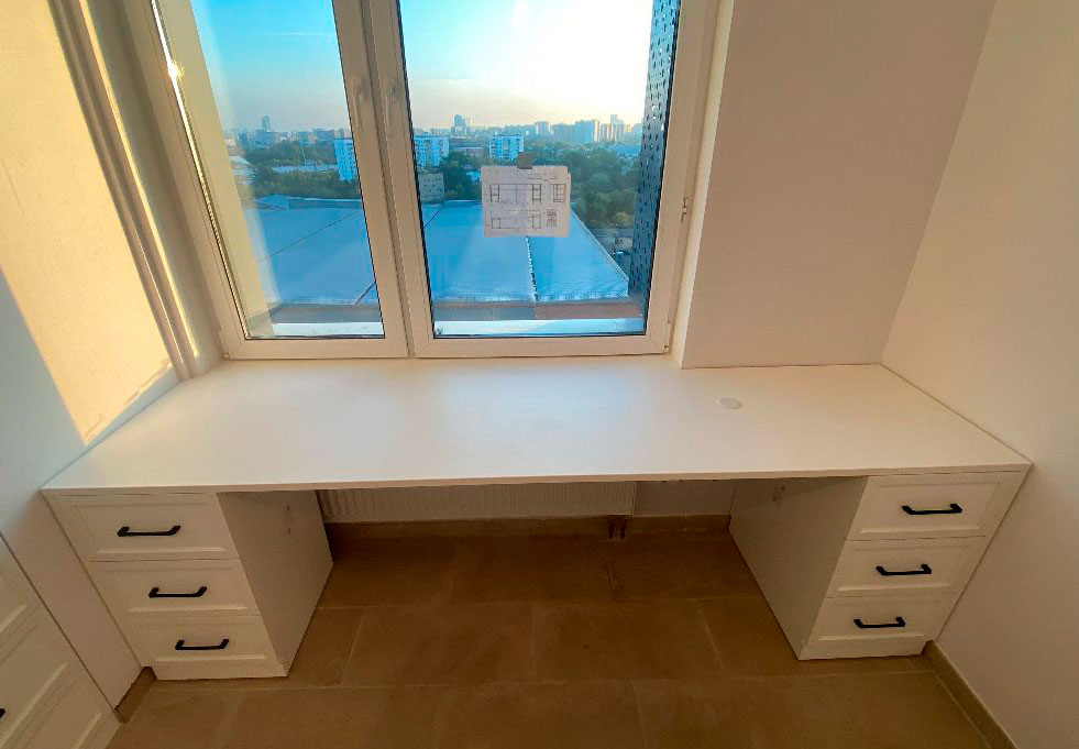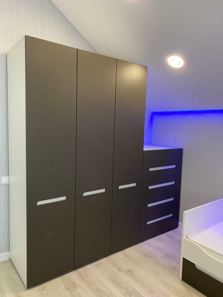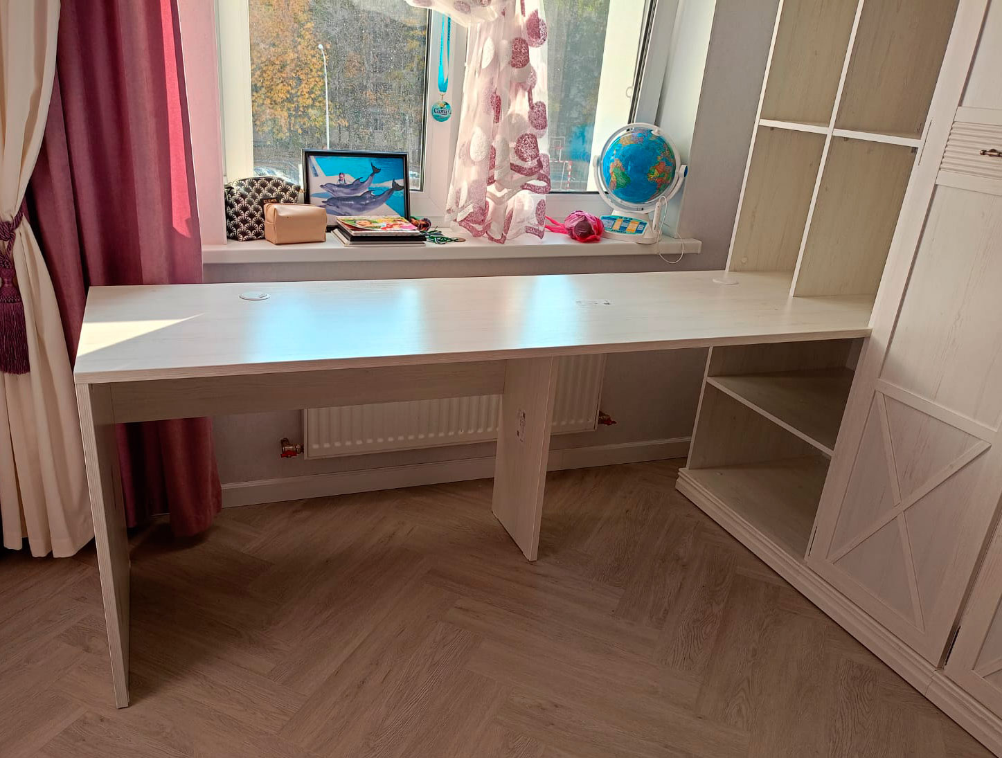 Детская: Одна просторная детская комната с двумя большими шкафами до потолка и встроенным рабочим столом для двоих детей. Шкафы выполнены с эмалевым покрытием глубокого цвета.