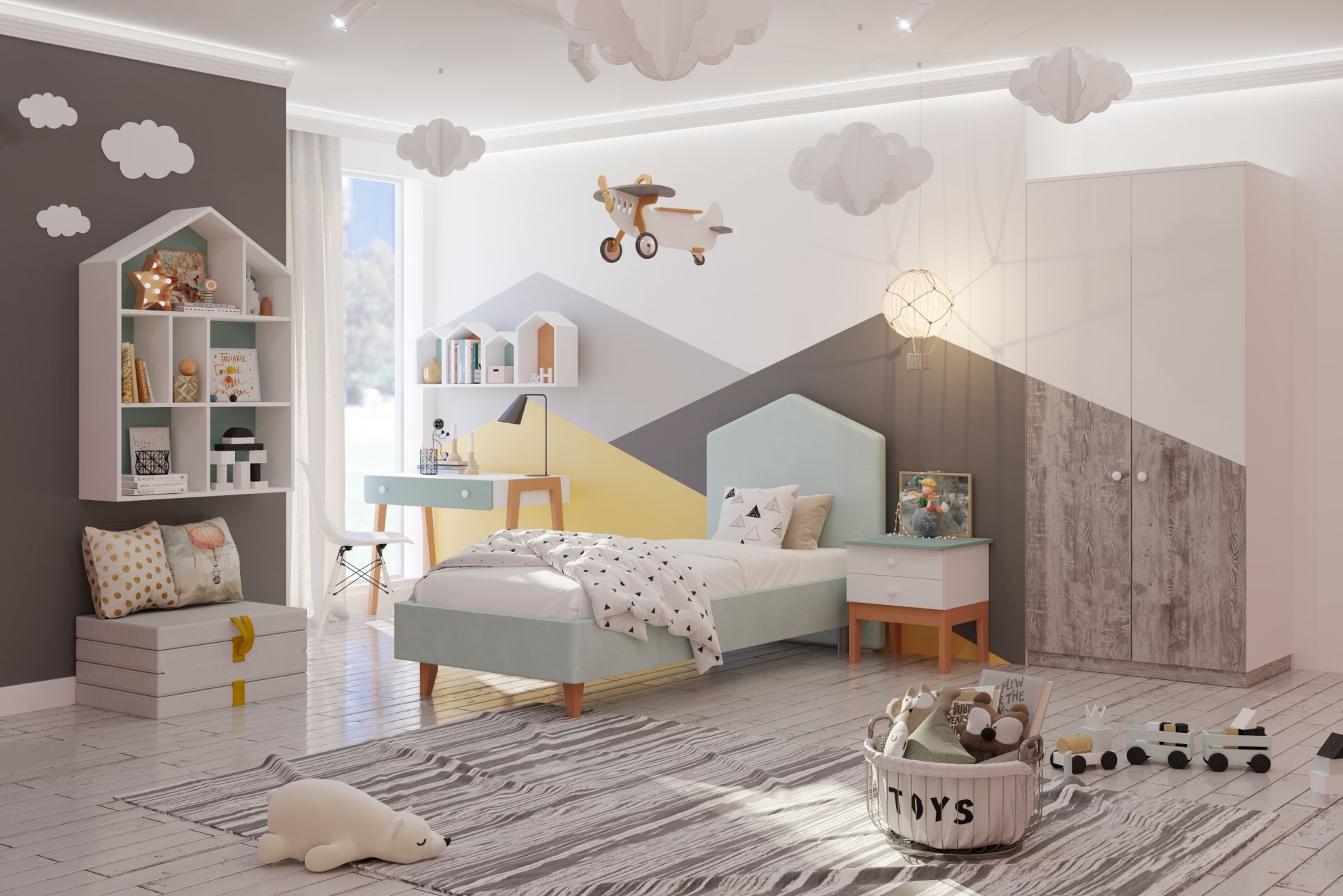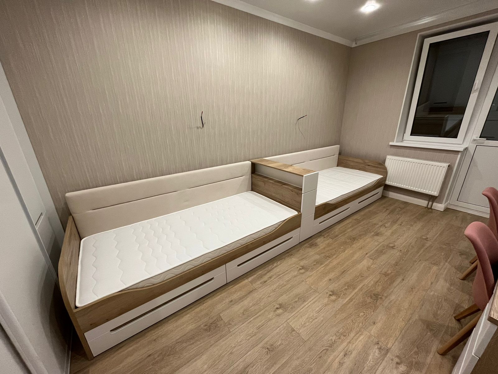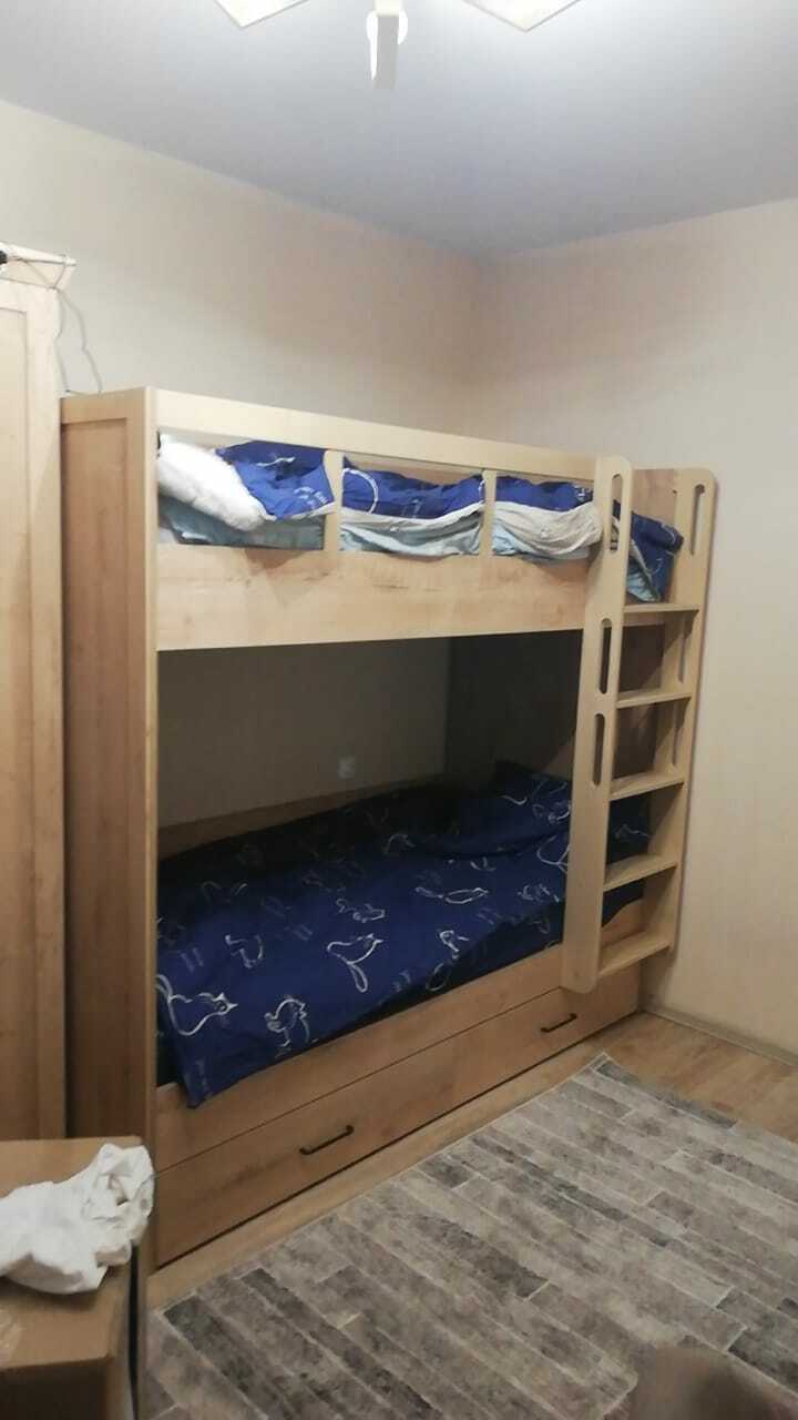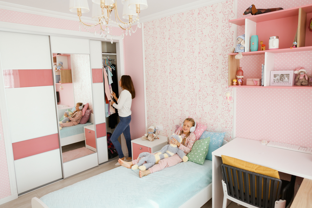 Детская: Одна просторная детская комната с двумя большими шкафами до потолка и встроенным рабочим столом для двоих детей. Шкафы выполнены с эмалевым покрытием глубокого цвета.