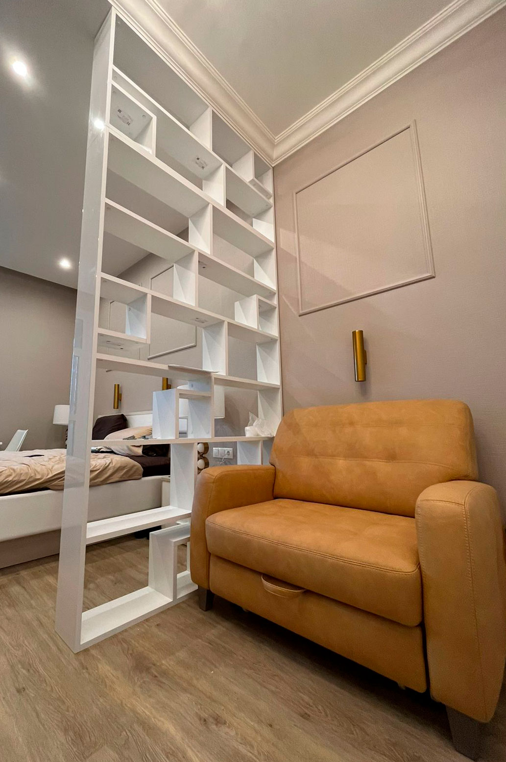 Важно визуально разделить пространство, не прибегая к массивным конструкциям, стенам или стеллажам во всю стену, которые могут перегружать жилую зону и занимать лишнее место.