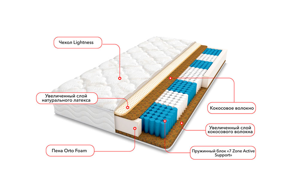 Основой данной модели является эргономичный пружинный блок «7 Zone Active Support» высотой 15 см. Каждая зона имеет разную степень жесткости и отвечает за поддержку конкретной анатомической зоны. Ортопедический эффект достигается за счет использования проволоки разного диаметра. Пружины обернуты кокосовым волокном, которое равномерно распределяет нагрузку. С одной стороны слой кокоса является основным и имеет толщину в 2 см, с другой — сочетается со слоем натурального латекса. Благодаря этому...