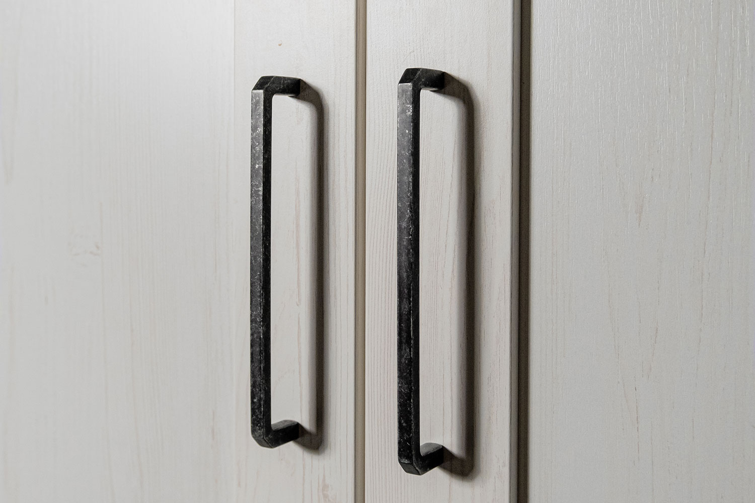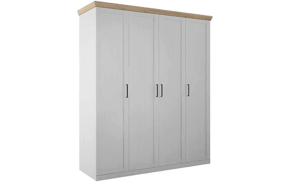 Вместительная модель с покрытием цвета «блан-шене» станет настоящим подарком для тех, кто давно мечтает о своей гардеробной. Платяной шкаф подойдет для минималистичной спальни или гостиной в современном оформлении. Изящный скошенный карниз в оттенке «дуб бунратти», лаконичные филенки и тонкие ручки-скобы, стилизованные под «античное железо черное», делают внешний облик мебели аккуратным и завершенным. Опорная часть замаскирована цоколем, выполненным в основном тоне.