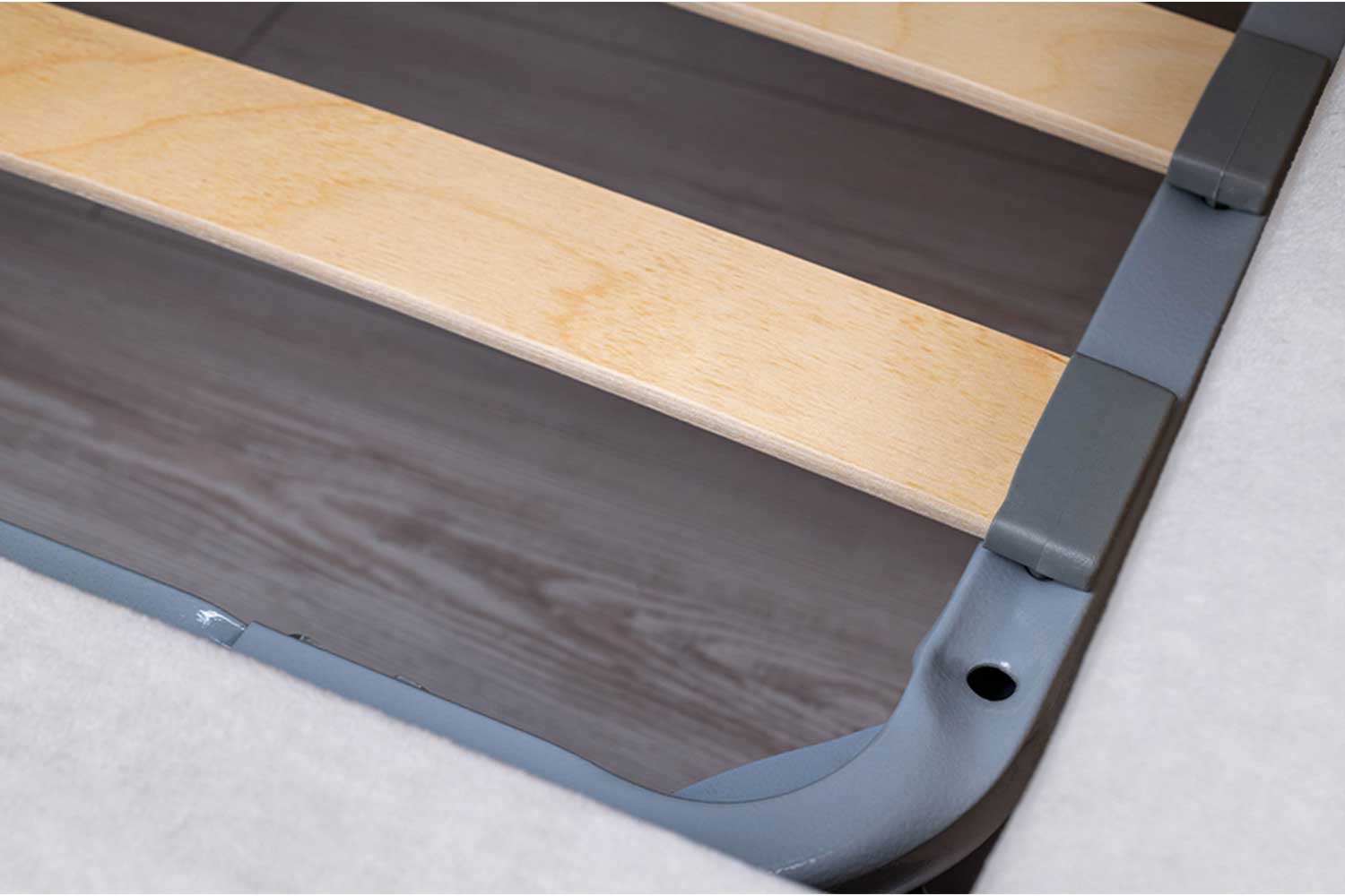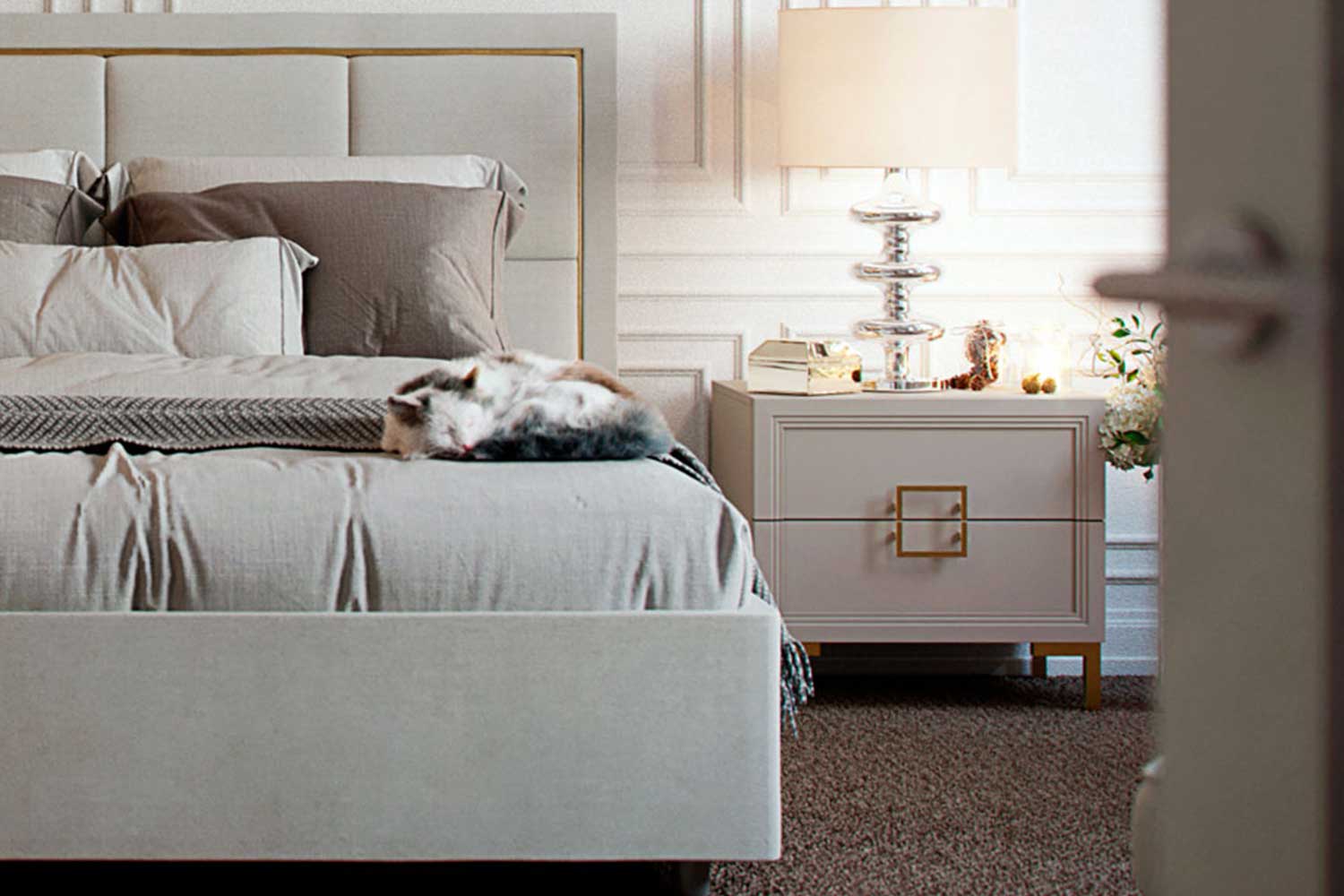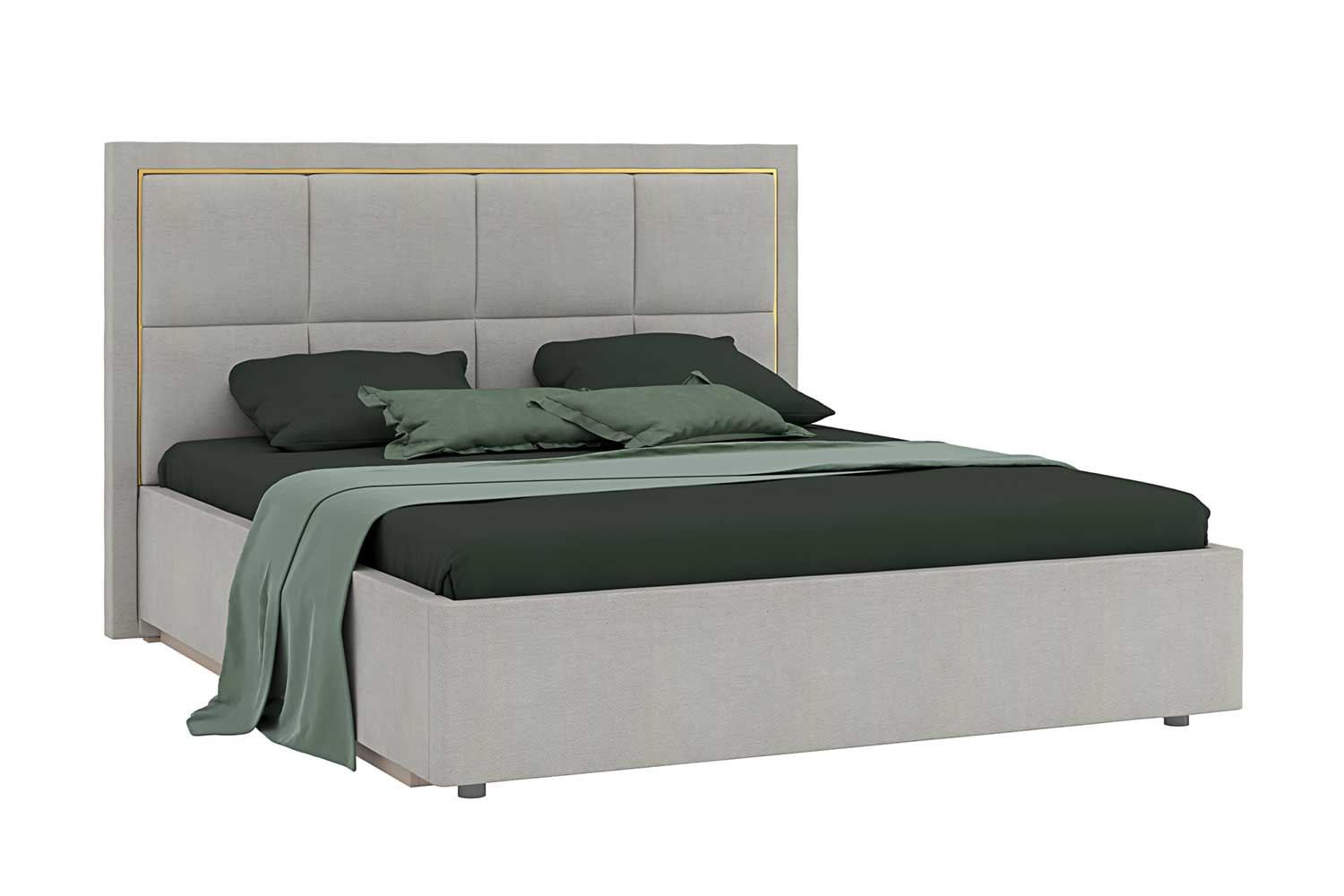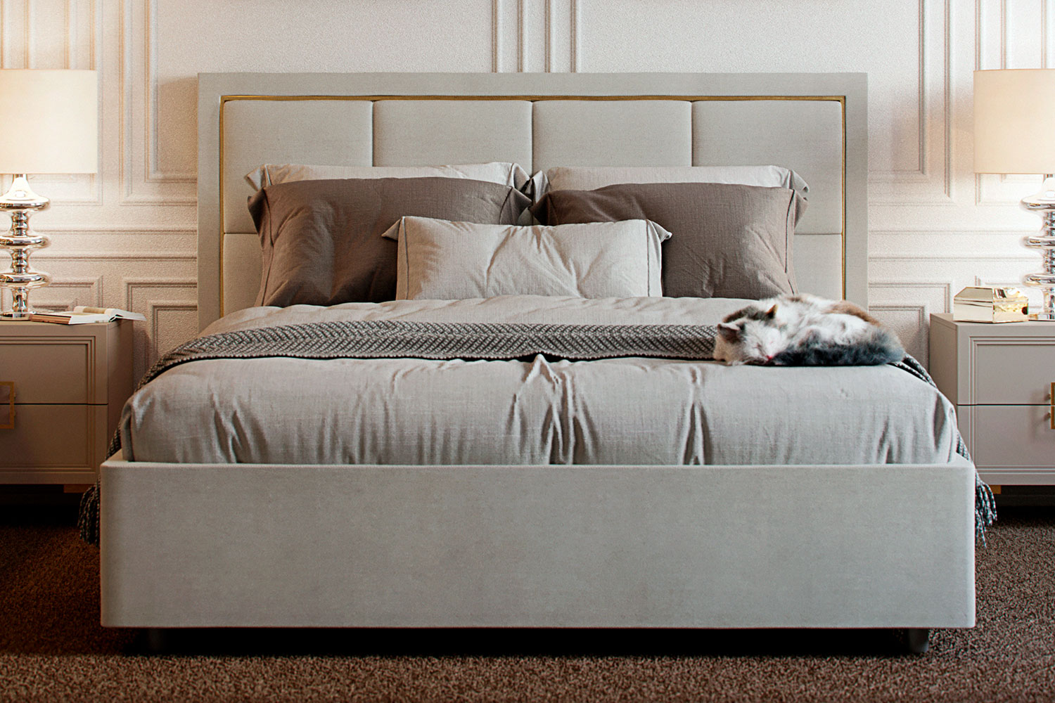 Высокое изголовье с простеганной обивкой украшено по периметру тончайшим золотым кантом. Металлизированная окантовка великолепно гармонирует с мягким микровелюром элегантного оттенка «серый кашемир». Материал отличается износостойкостью и приятной на ощупь бархатистой поверхностью. Плавно закругленные углы и ножки цилиндрической формы придают мебели завершенный и изящный вид. Конструкция оснащена подъемным механизмом, скрывающим вместительный отсек для хранения постельного белья. Основание из прочной стальной рамы и упругих гнутоклееных ламелей обеспечивает ортопедические свойства изделия.