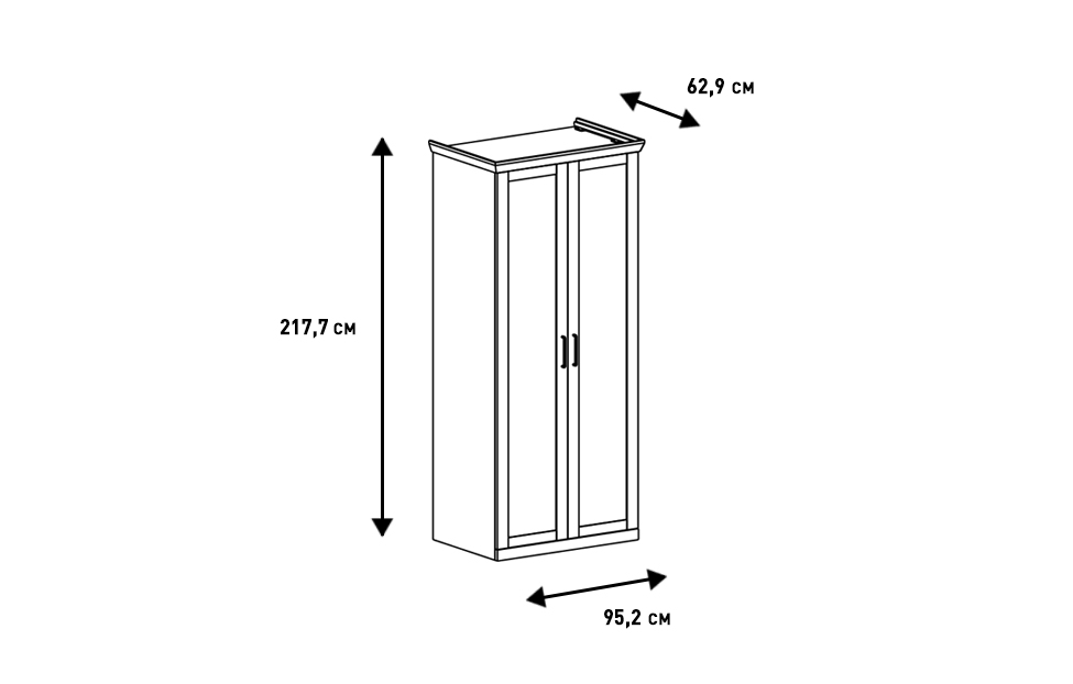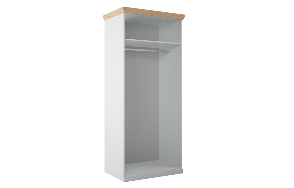 Две распашные дверцы предоставляют полный доступ к внутреннему содержимому в виде единственного просторного отделения. Наполнение мебели стандартное: верхняя полка и отсек со встроенной штангой. По запросу покупателя возможна установка четырех дополнительных полок из ЛДСП. Надежная фурнитура и прочный крепеж обеспечат продолжительный срок службы изделия. Отдельно стоящую систему хранения следует обязательно крепить к стене во избежание падения.