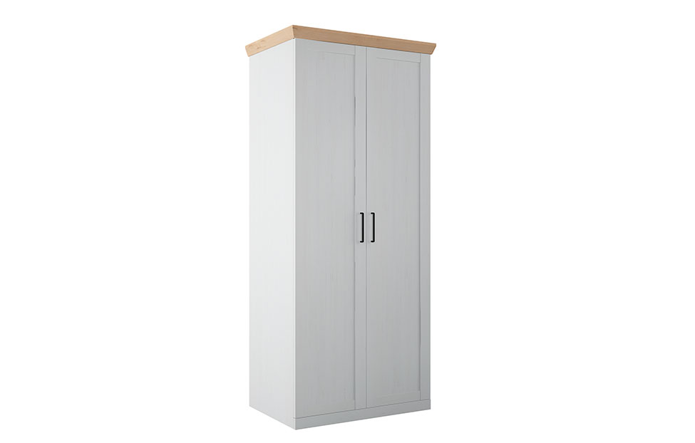 Напольный платяной шкаф, увенчанный элегантным выступом, станет великолепным дополнением для спальни в стиле кантри, эко, неоклассика, сканди. Корпус мебели изготовлен из ламинированной ДСП и имеет белое матовое покрытие «блан-шене» в противовес древесной текстуре карниза «дуб бунратти». Рамочная конструкция оформлена предельно минималистично: простые филенки гармонично сочетаются с темными ручками-скобами.