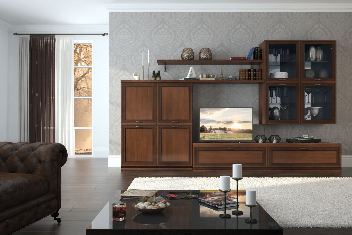 Для создания еще более гармоничного интерьера в гостиную можно дополнительно подобрать кремовый или темный диван классических форм, изящный журнальный столик со стеклянной поверхностью. Если же вы хотите совместить гостиную с рабочей зоной — не забудьте про стол на высоких ножках и мягкое кресло с текстурной обивкой.