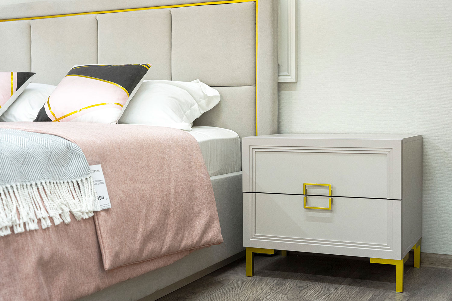 - Декоративная акцентная рама в изголовье кровати повторяет форму ручек.