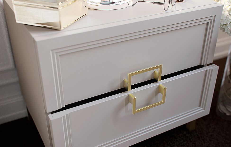 - Основу дизайна составляет геометрический символ — квадрат. Это видно по золотым матовым ручкам на тумбах;