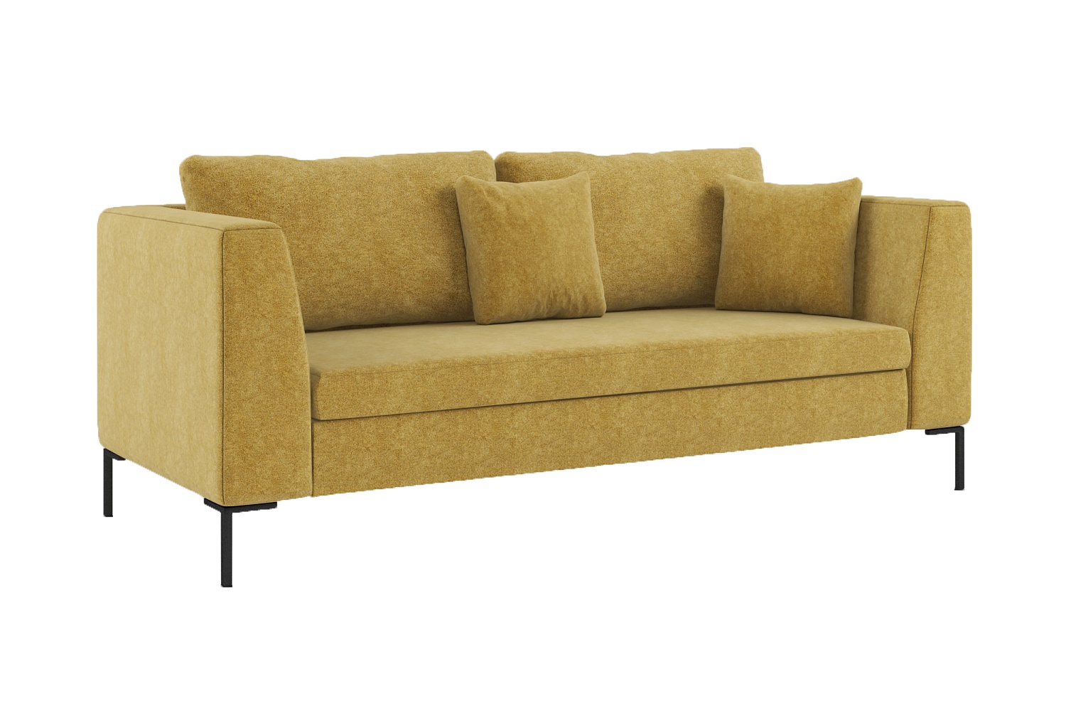 Трехместный прямой диван-кровать «Челси» подходит для размещения в спальне, гостиной, детской комнате в современном стиле. Обивка из микровелюра гипоаллергенна, приятна на ощупь, обладает высокой стойкостью к износу и истиранию. Желтый, близкий к карри, цвет эффектно контрастирует с черными опорами-ножками из металла. В комплект входят декоративные подушки. Безусильный механизм трансформации позволяет превратить диван в удобное спальное место и подходит для ежедневной эксплуатации. Сиденье одним движением выдвигается вверх и вперед, а спинка опускается...
