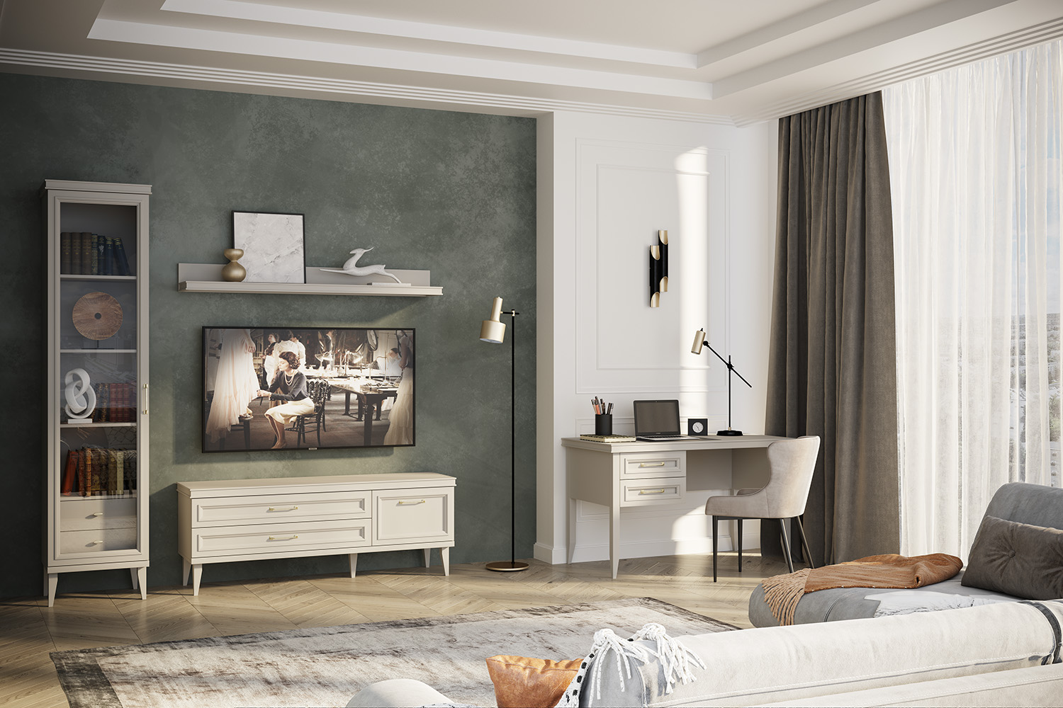 – описание: размер 58x152x42.5 см, стиль английский, неоклассика, цвет ярко-серый.