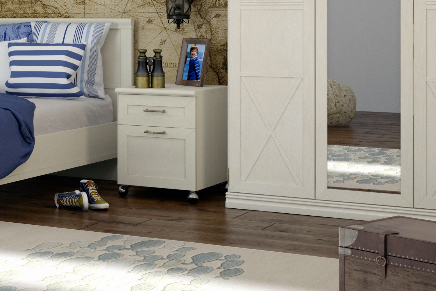 Представленный комплект содержит все необходимое для обустройства элегантной молодежной комнаты в стиле кантри, прованс или классика. Длинная односпальная кровать с высокой спинкой на скошенных ножках поможет с комфортом разместиться на ночной отдых и облегчит уборку подкроватного пространства. Лаконичный письменный стол идеально подойдет подростку или студенту. Трехстворчатый шкаф и двухсекционный шкаф-тумба позволят рационально использовать полезную площадь. В роли дополнительных систем хранения выступают компактная тумбочка и настенная полка. Светлый оттенок покрытия «валенсия» подчеркнут темной фурнитурой в цвете «античная бронза». За счет четкой геометрии, изящных карнизов, тонких линий фахверков и фрезеровки мебель выглядит легкой и визуально расширяет помещение. Невысокие цоколи хорошо скрывают регулируемые металлические опоры. При изготовлении комплекта производитель использовал такие экологичные материалы, как ЛДСП, МДФ-профиль и ДВП.