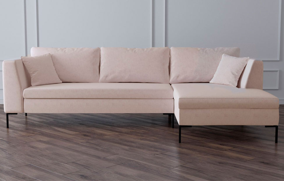Нежно-розовый оттенок обивки визуально облегчает конструкцию «Челси», делает модель невесомой, воздушной, словно парящей в воздухе. Этот эффект подчеркивают контрастные тонкие ножки из окрашенного в черный цвет металла. Угловая модель станет полноценным украшением современного интерьера, обстановки в стиле сканди или модерн, облагородит помещение в светлых тонах и оживит слишком приглушенный дизайн.