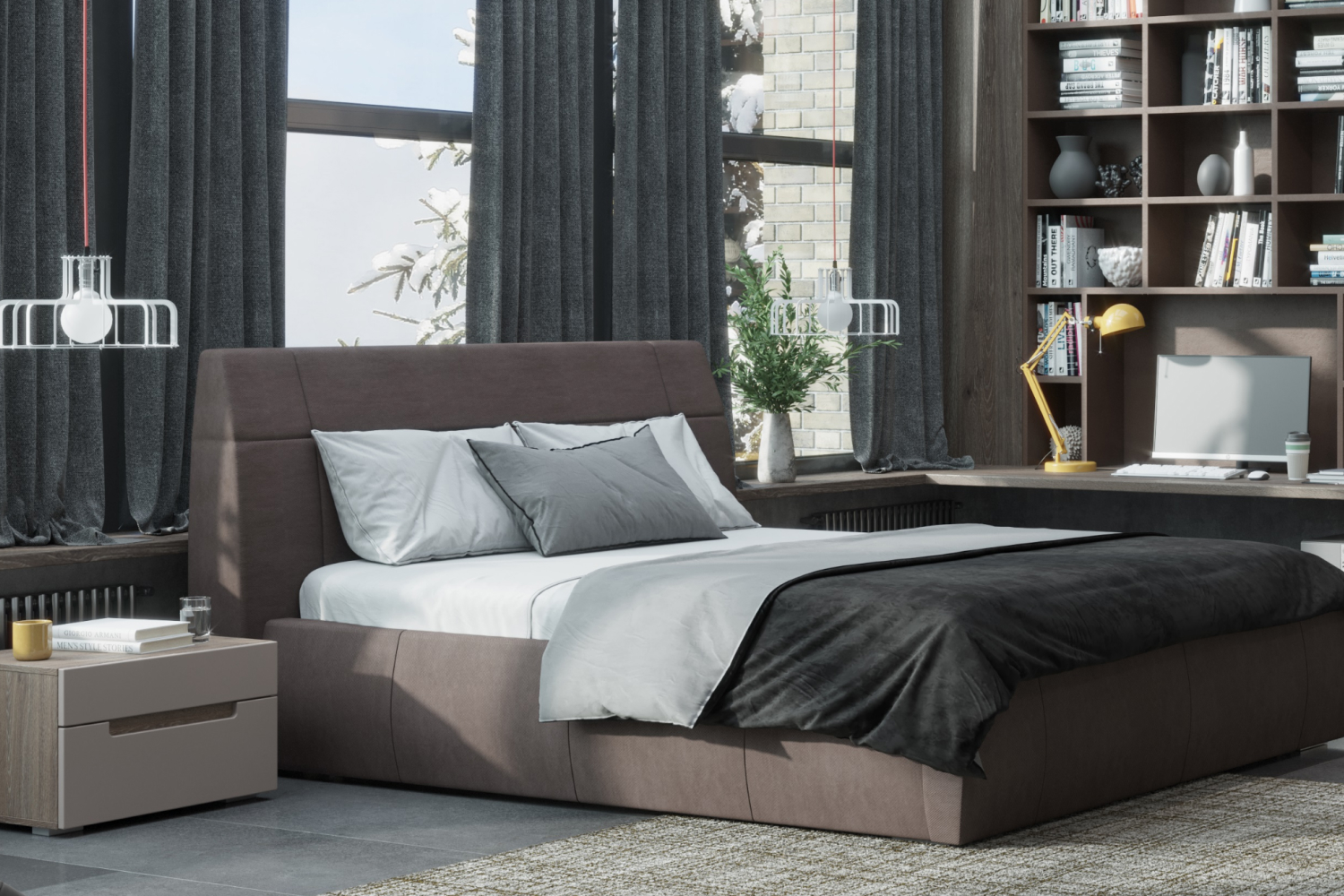 - Спальня в современном минималистичном стиле. Такая мебель универсальна и подойдет интерьерам в стилях эко, скандинавский, минимализм и лофт (в его более «легком» варианте);