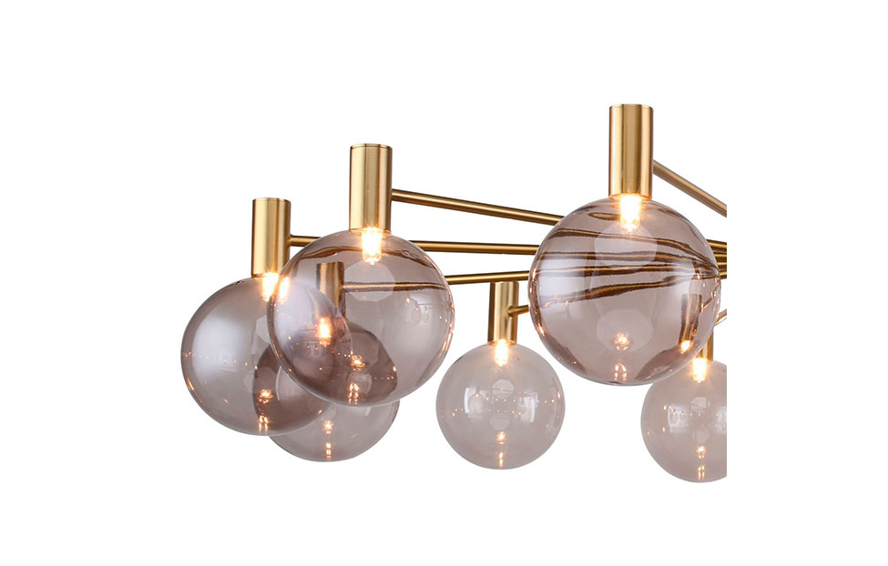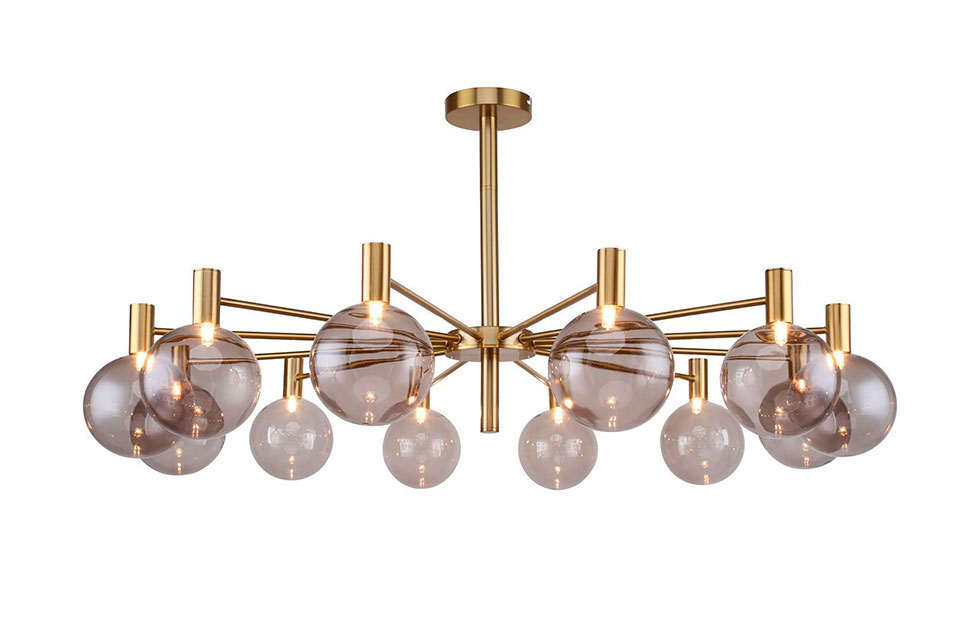 - Особенность: каркас цвета латунь, круглые плафоны из стекла коньячного оттенка;
