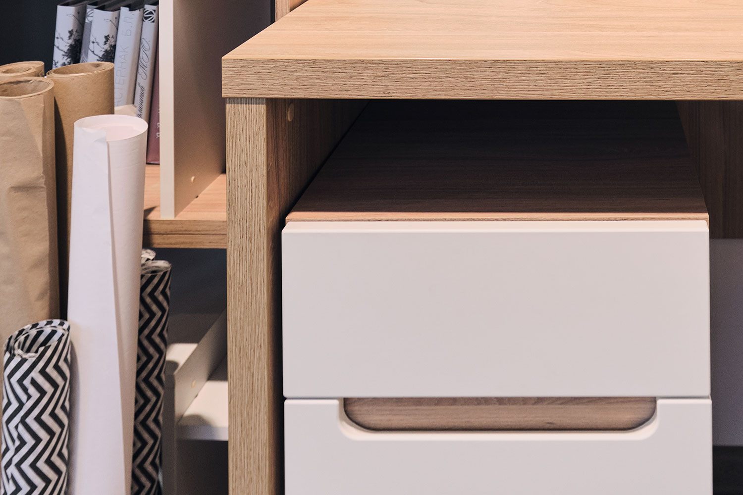 - В выдвижных ящиках используются направляющие скрытого монтажа со встроенным доводчиком. Это позволяет легко и почти бесшумно выдвигать-задвигать ящики, а также обеспечивает надежную фиксацию ящика и гарантирует длительный срок службы даже при высокой нагрузке.