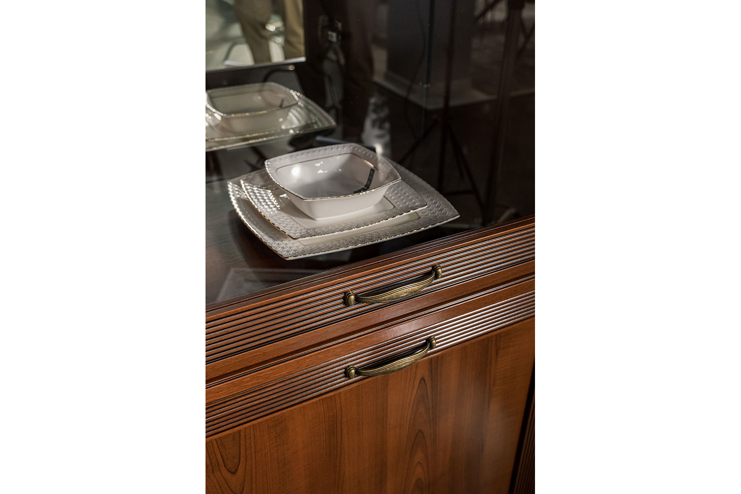- На задних стенках шкафов со стеклянными вставками есть зеркала. Это помогает зрительно расширить комнату.