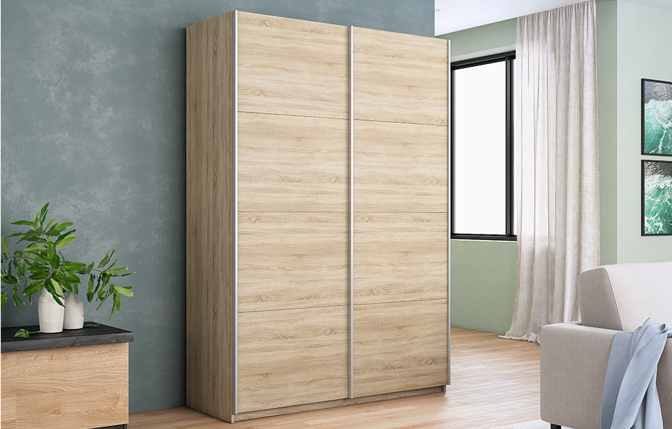 Лаконичный шкаф выполнен в точном соответствии с модными трендами: гладкие поверхности, стилизация под древесную текстуру, отсутствие фурнитуры. Широкие створки легко сдвигаются вбок одним движением руки. Алюминиевый профиль окрашен в серебристый оттенок, контрастно подчеркивающий основной теплый тон.