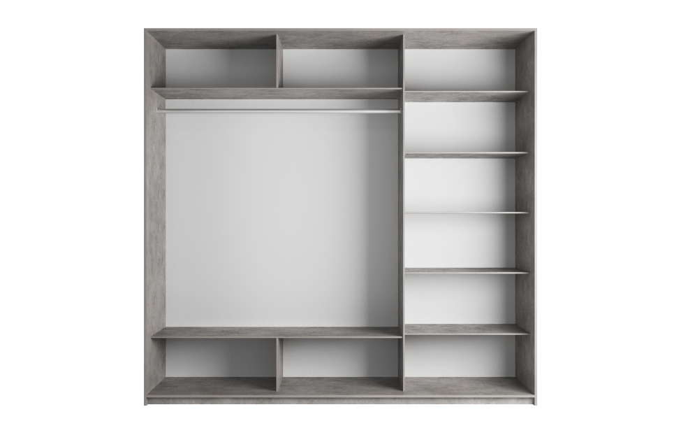 - Внутреннее пространство разделено на 3 части — две части объединены в одну, содержат штангу и по 2 ниши сверху и снизу. Третья часть укомплектована пятью полками;