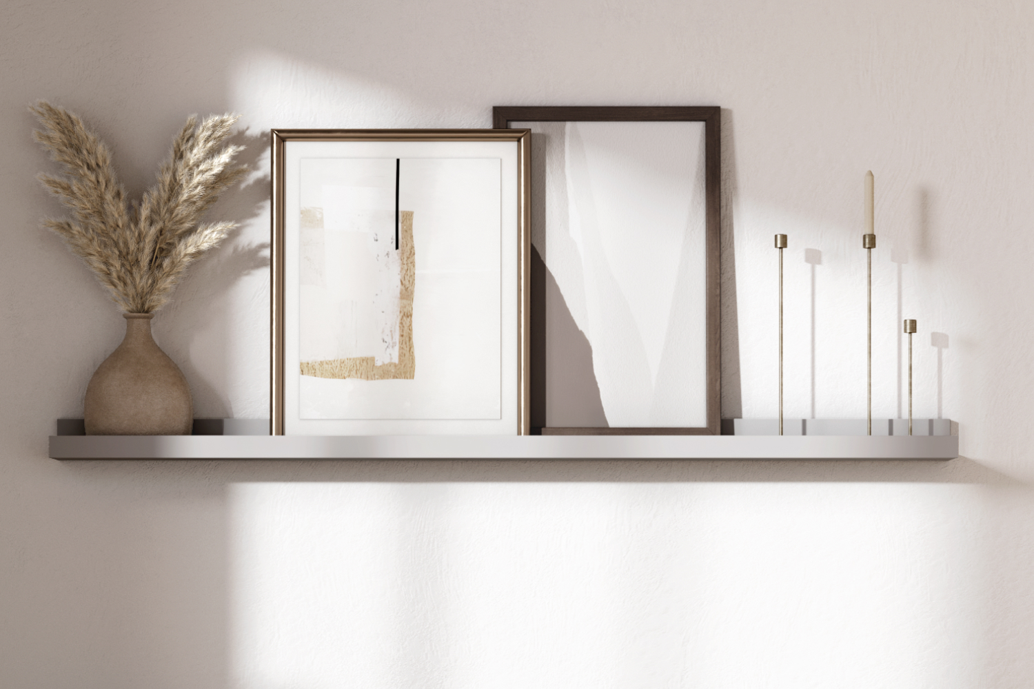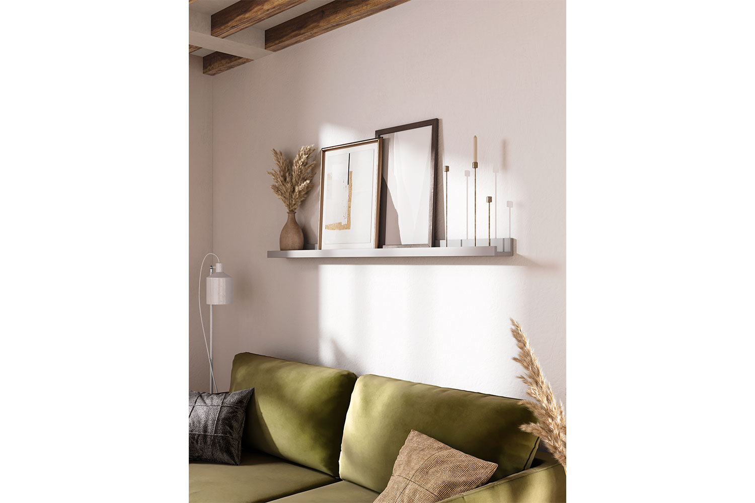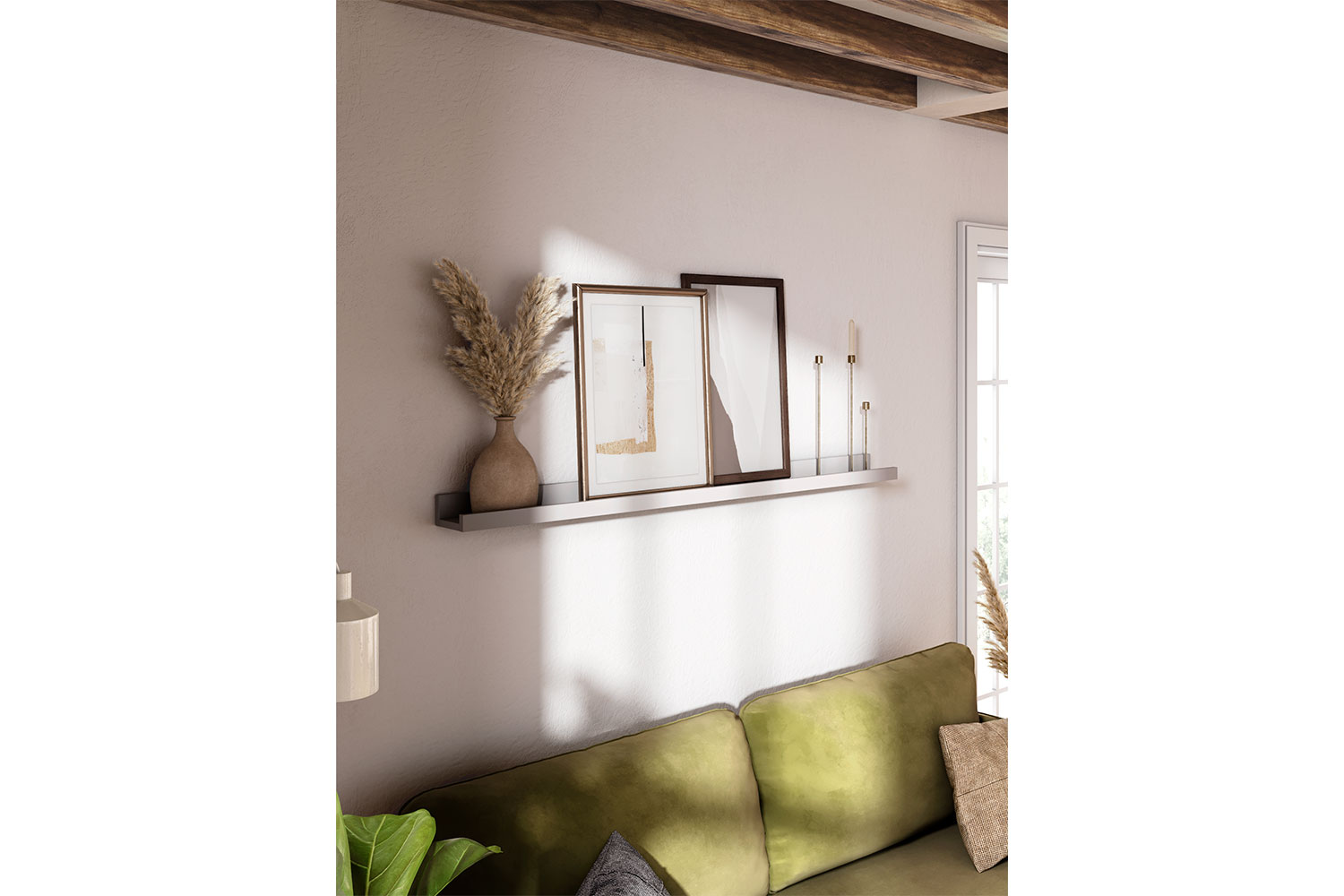 Полку можно использовать в композиции — комбинировать несколько вариантов размеров, чтобы создать настоящую галерею семейных фотографий или картин. Передний ограничительный профиль не даст соскользнуть предметам с полки.