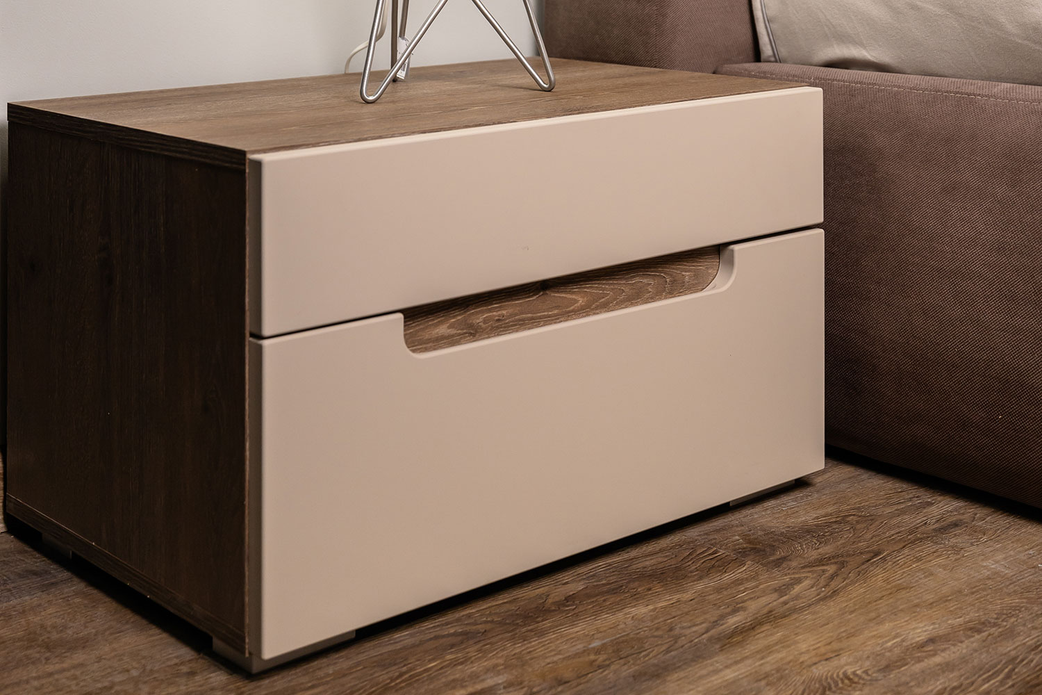 - Корпус мебели Анри выполнен в цвете «давос трюфель», фасады — в бежевом цвете;