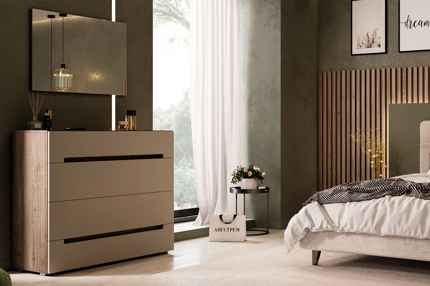 - Спальня в современном минималистичном стиле. Такая мебель универсальна и подойдет интерьерам в стилях эко, скандинавский, минимализм и лофт (в его более «легком» варианте);