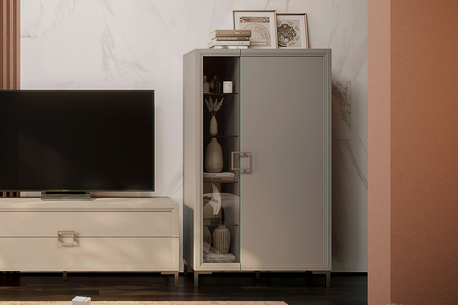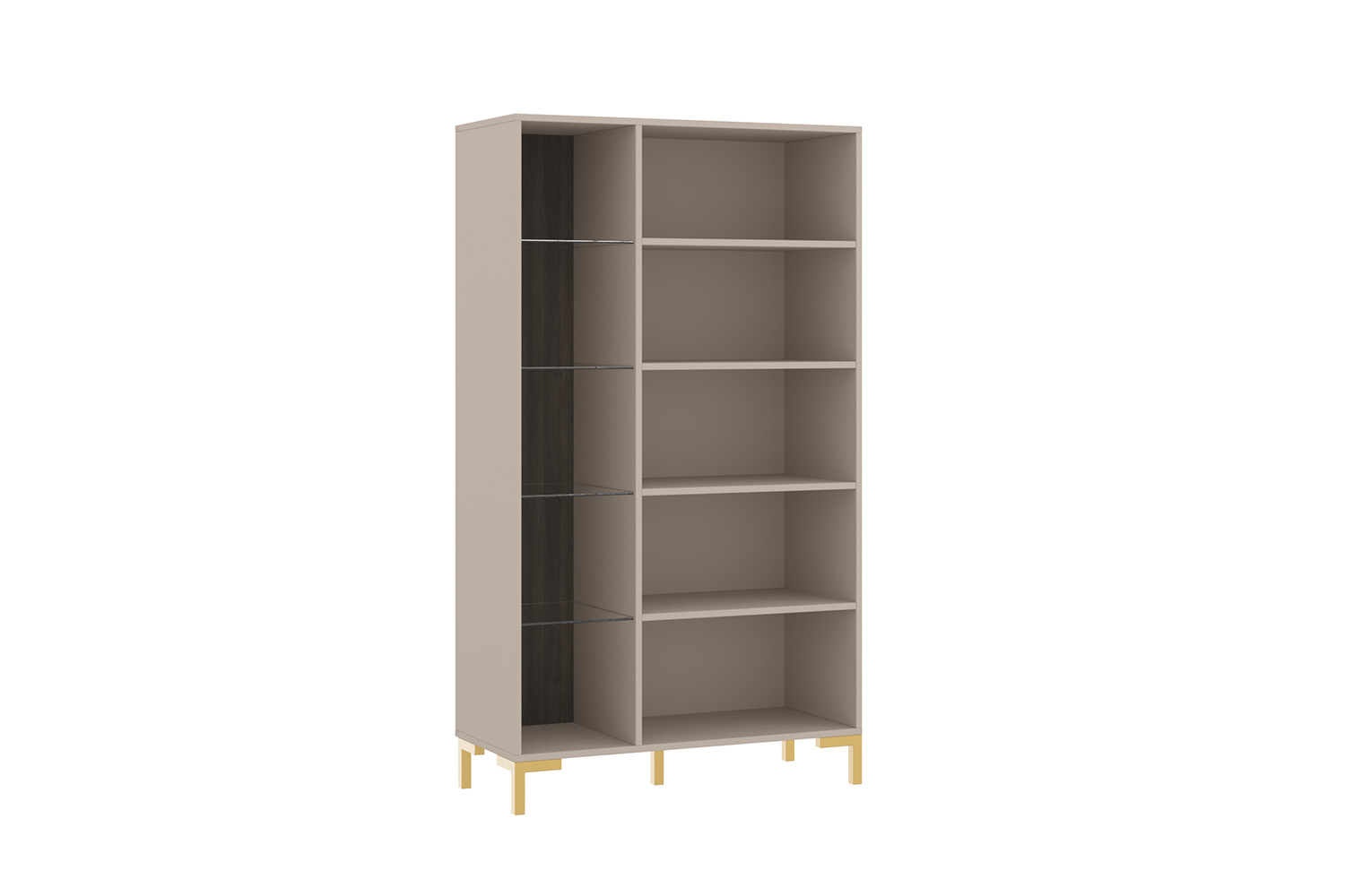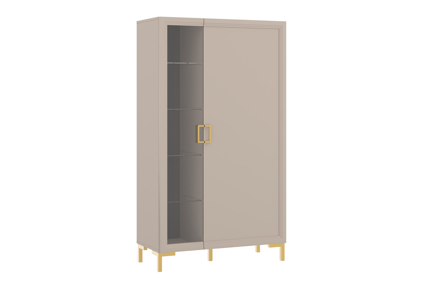 - Внутреннее наполнение: 4 стеклополки 6 мм за стеклянным фасадом, и 1 полка ЛДСП 16 мм — за глухим;