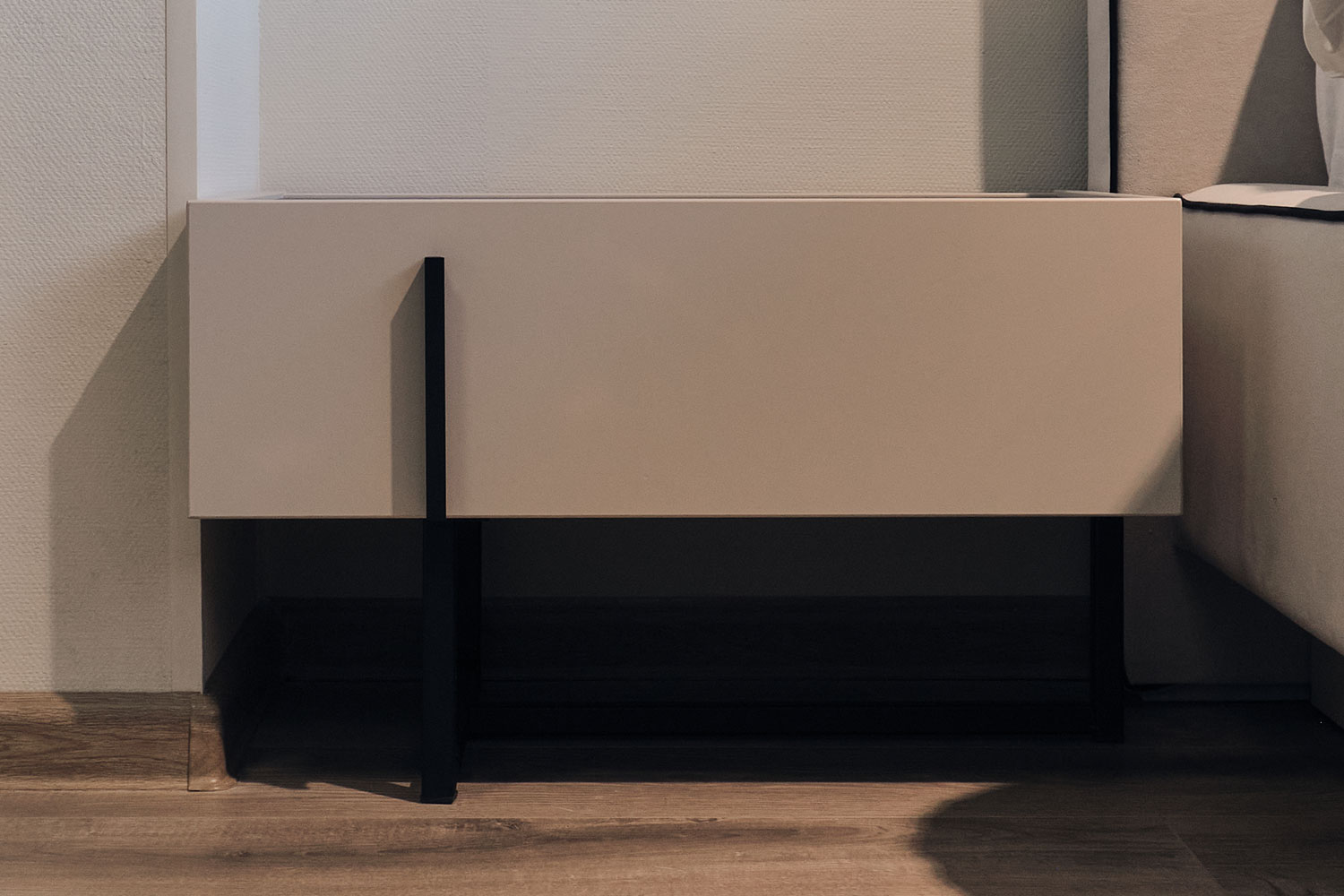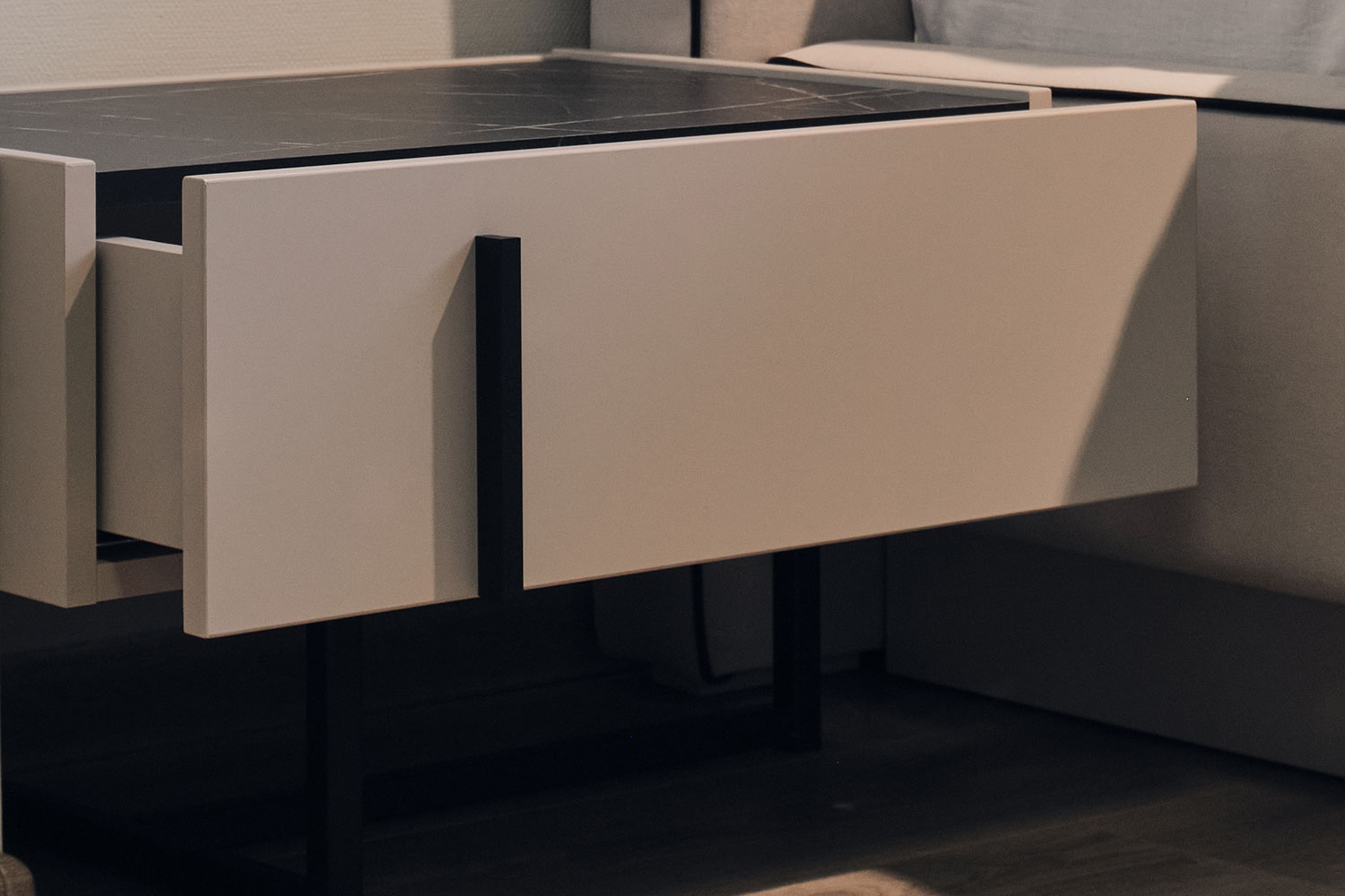 - Прикроватная тумба МИ-300.10 оснащена одним выдвижным ящиком и тремя металлическими опорами;