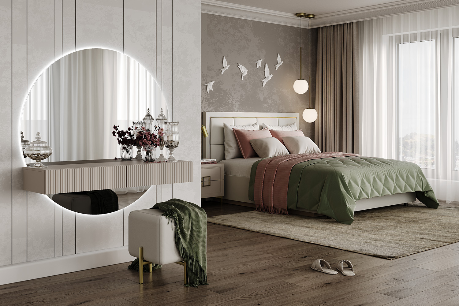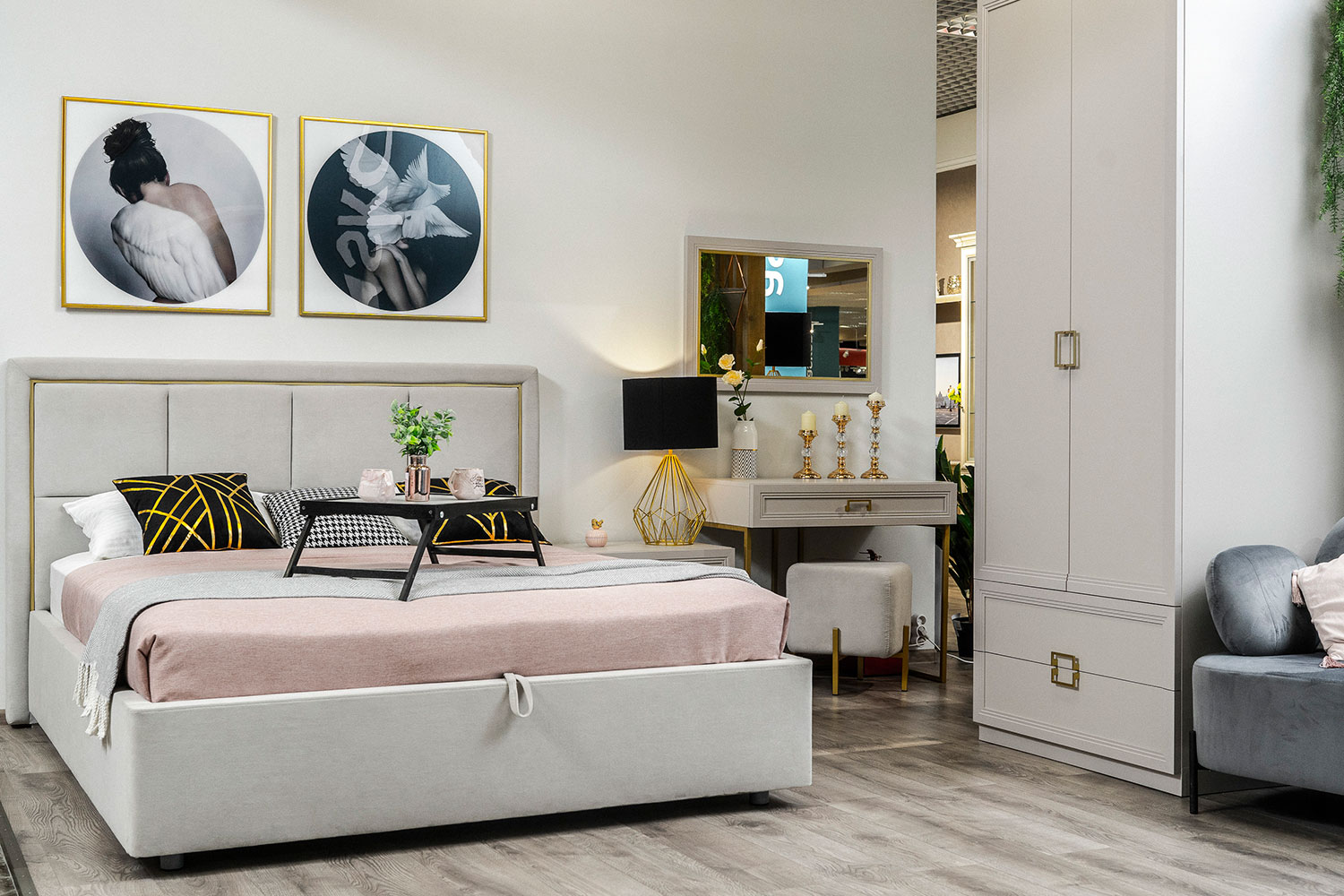 - Спальня Дольче выполнена в стиле эклектики, а также соединяет в себе стиль ар-деко в современном прочтении и минимализм. К строгим формам и безупречной геометрии добавлена гладкая текстура кашемира, позволяющая смягчить декор и подарить коллекции шлейф тонкой роскоши с золотыми вставками;