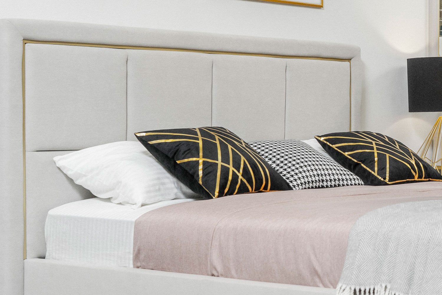 - Декоративная акцентная рама в изголовье кровати повторяет форму ручек.