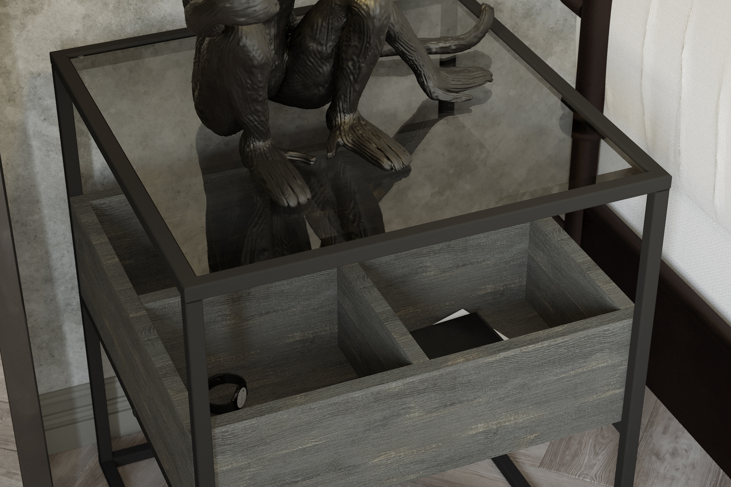 Прикроватная тумба Кассо выполнена в современном лаконичном стиле и уместно дополнит интерьер спальной комнаты. Стильная тумба приковывает внимание, прежде всего, своим исполнением: комбинацией материалов. Стеклянная столешница из тонированного закаленного стекла в сером цвете дополнена ячейками из ЛДСП для удобного хранения подручных вещей. А прочный металлический каркас толщиной 15 мм обеспечивает высокую прочность и устойчивость. В комплект входит вся необходимая фурнитура и удобная инструкция для сборки. Максимальная нагрузка на стекло до 5 кг, на ящик до 10 кг.