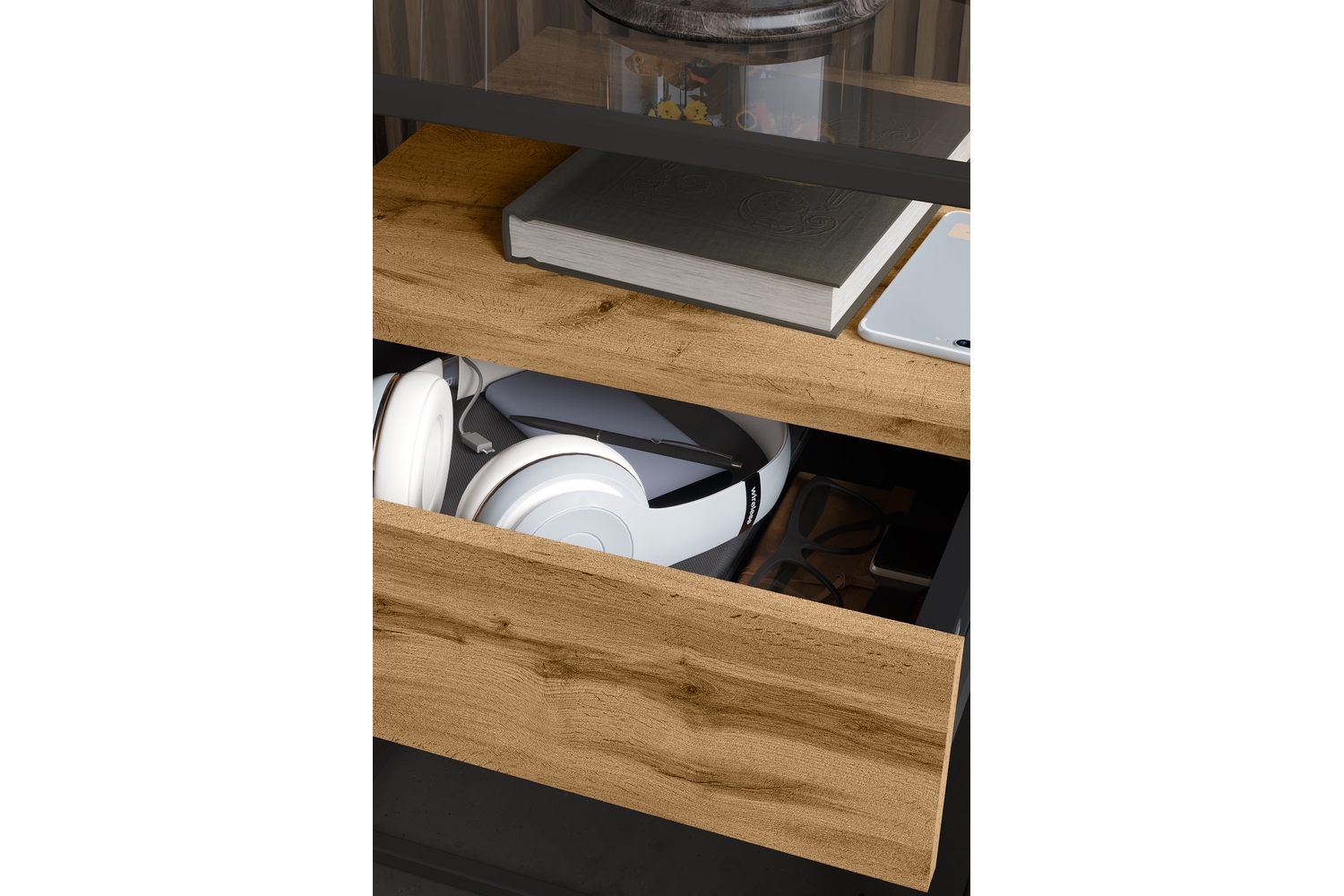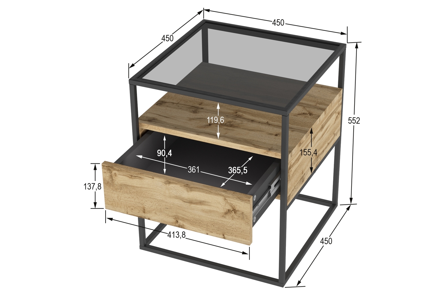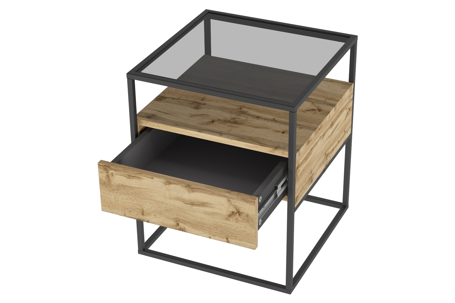 Прикроватная тумба Эйд выполнена в современном лаконичном стиле и уместно дополнит интерьер гостиной. Стильная тумба приковывает внимание, прежде всего, своим исполнением: комбинацией используемых материалов. Стеклянная столешница из тонированного закаленного стекла в сером цвете дополнена полкой и ящиком для удобного хранения подручных вещей с системой открывания PUSH-TO-OPEN. А прочный металлический каркас из профиля толщиной 15 мм обеспечивает высокую прочность и устойчивость.
