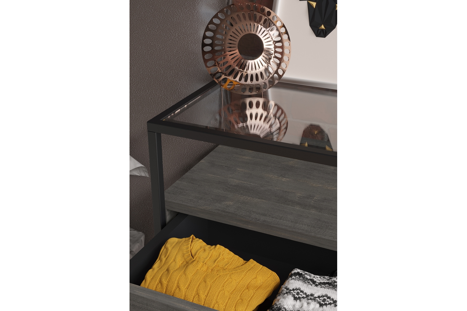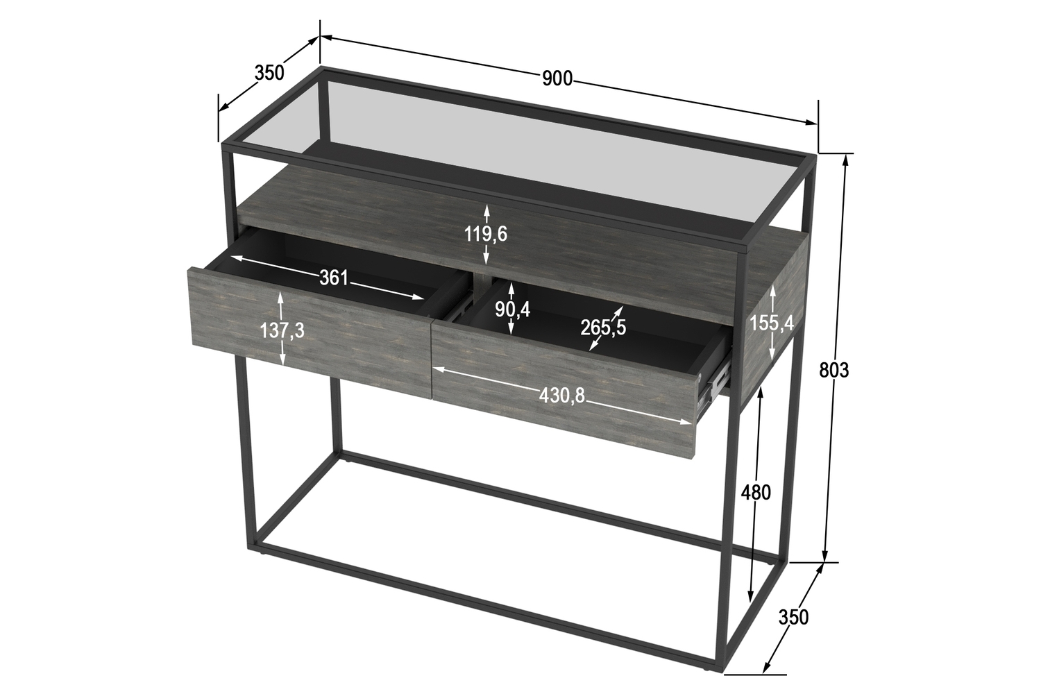 Консоль Эйд выполнена в современном лаконичном стиле и уместно дополнит интерьер спальной комнаты или прихожей. Стильная консоль приковывает внимание прежде всего своим исполнением: комбинацией используемых материалов. Стеклянная столешница из тонированного закаленного стекла в сером цвете дополнена полкой и ящиками для удобного хранения подручных вещей с системой открывания PUSH-TO-OPEN. А прочный металлический профиль толщиной 15 мм обеспечивает высокую прочность и устойчивость.