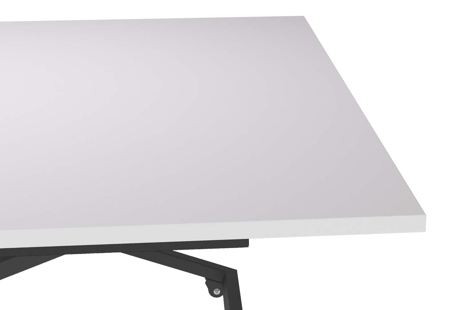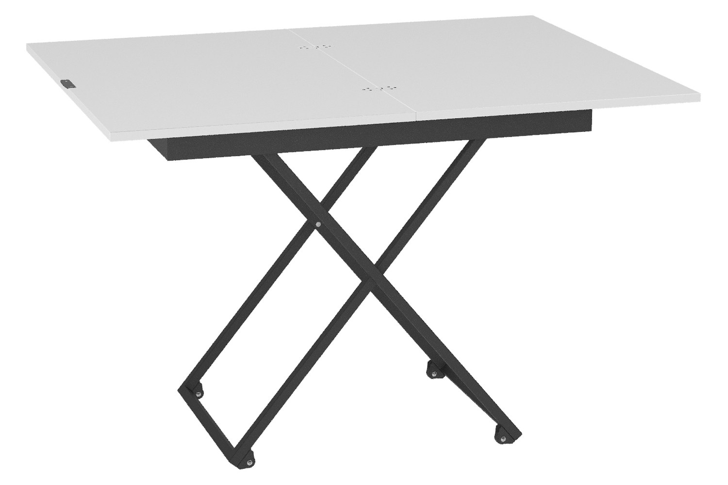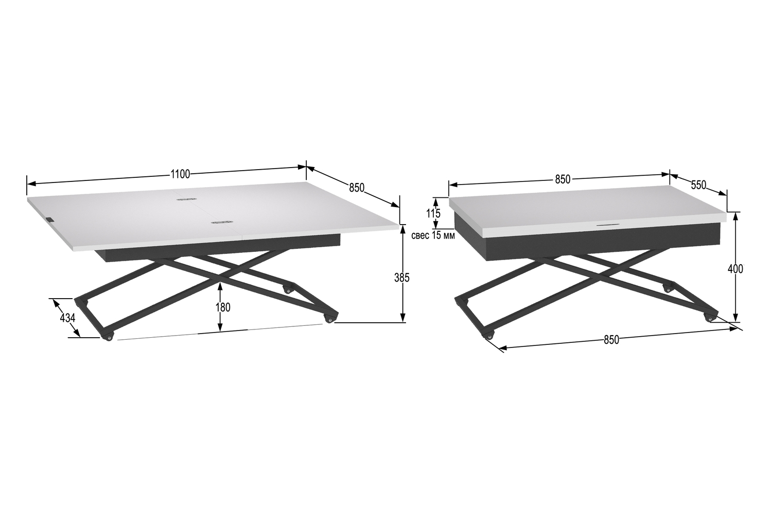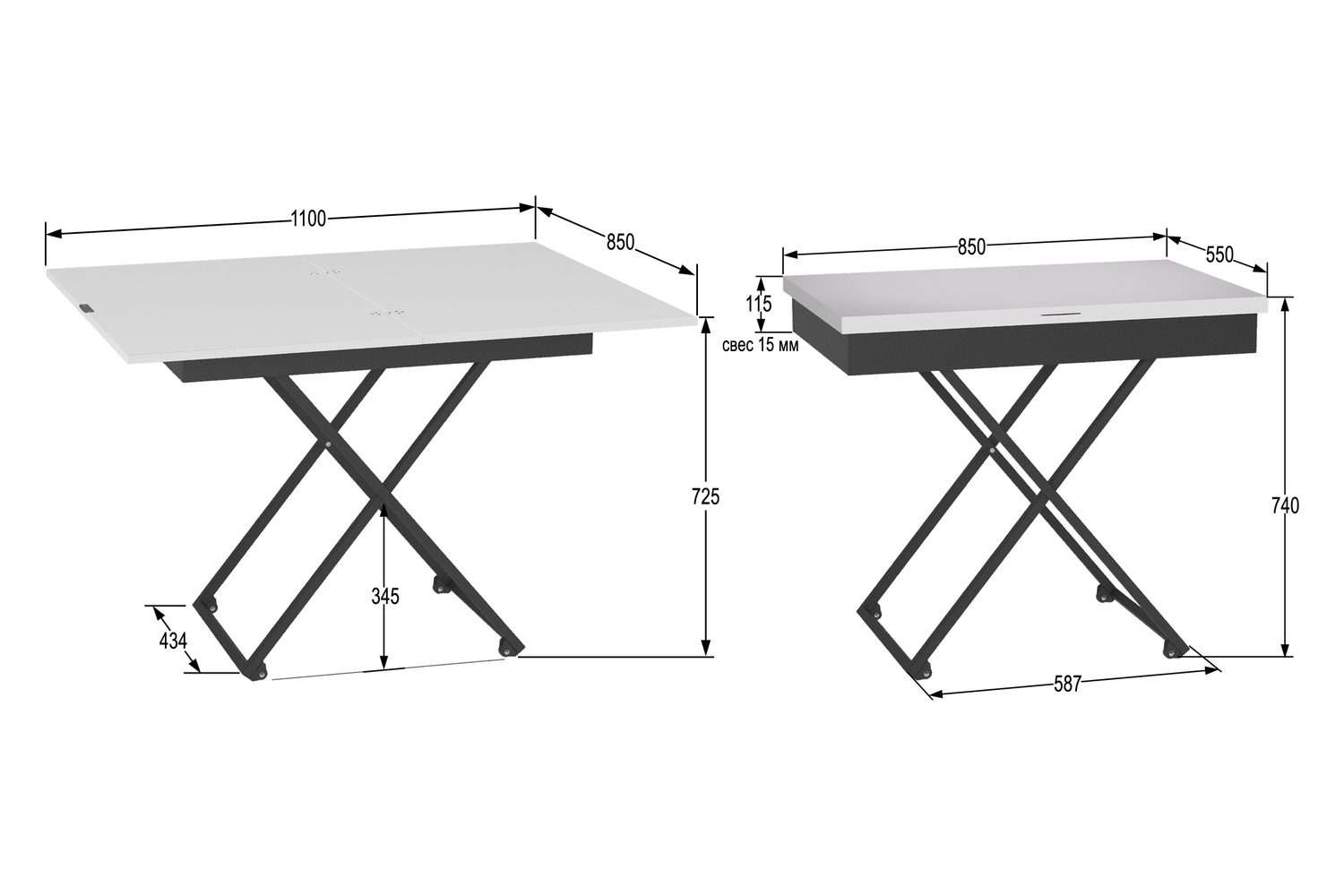 Размеры столешницы в сложенном состоянии 85 x 55 cм, в разложенном — 110 х 85 cм. По высоте стол имеет два положения (разложенный/сложенный): 38,5/40 см и 72,5/74 см. Ножки стола выполнены из прочного металлического профиля, столешница — из ЛДСП. Стол на прорезиненных роликовых опорах, что без труда позволит перемещать его в помещении, при этом не царапая и не повреждая напольное покрытие.