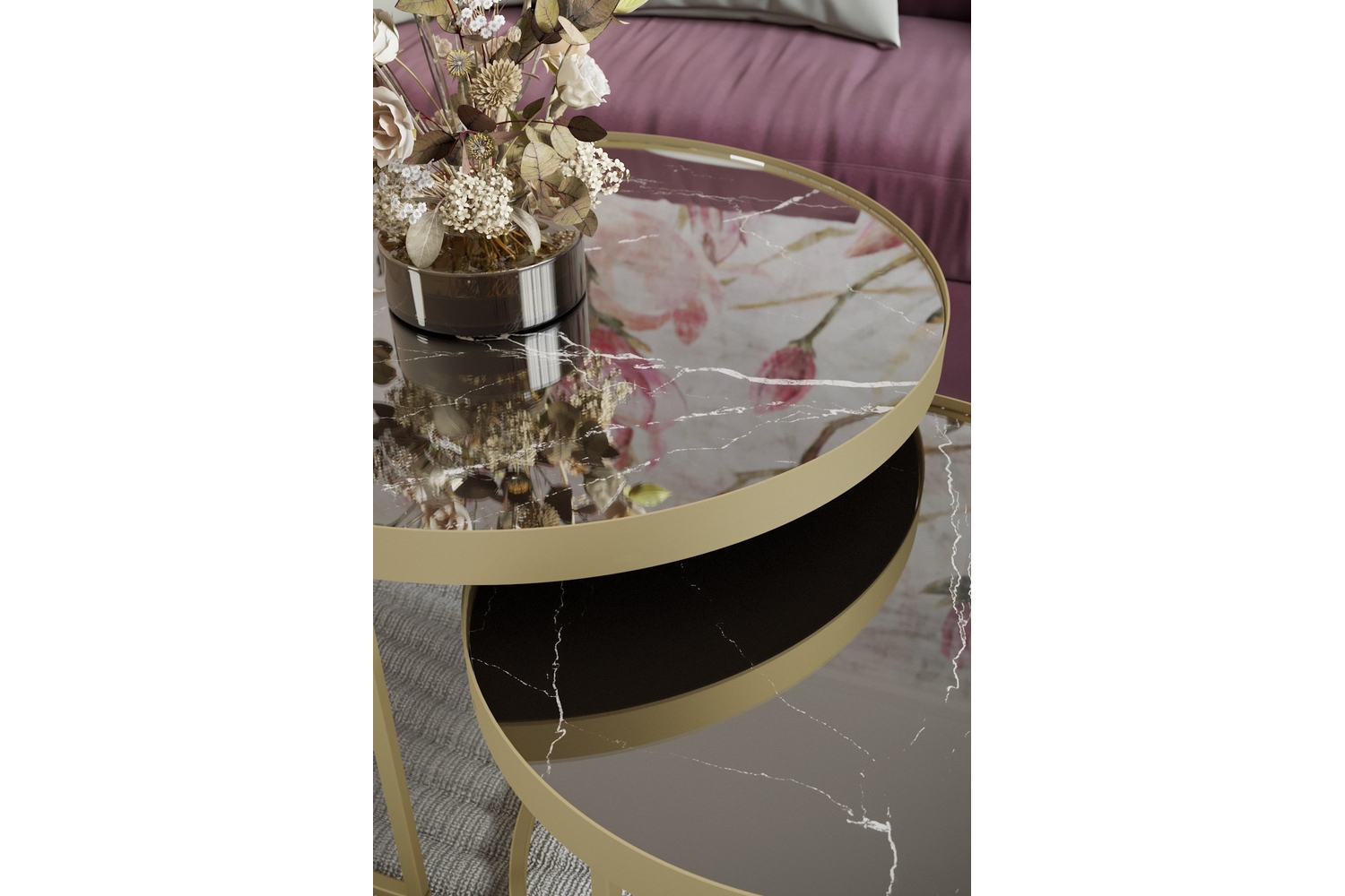 Парный журнальный столик «Джуан» представляет собой гармоничную и функциональную композицию из двух столиков разной высоты и диаметра, расположенных один над другим. Дизайнерский прием - способность разместить данную модель любым комфортным способом или использовать каждый из них по отдельности. Стеклянная столешница с УФ-печатью с точностью передает естественную красоту мраморного рисунка. Основание полностью изготовлено из прочного полированного металла, а титановый цвет опор лаконичен и безупречен в своем блестящем металлическом исполнении. Благодаря своей строгой элегантности и универсальности журнальные столики легко комбинируются с мебелью в современном стиле.