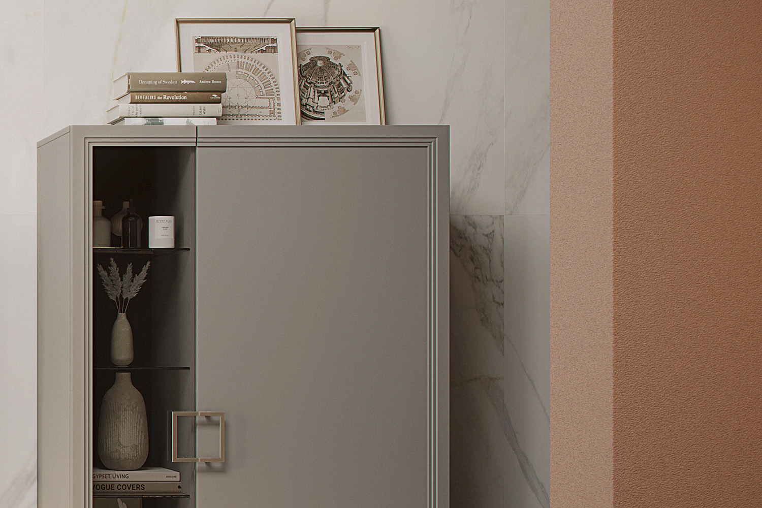 - Шкаф ДЛ-207.17 — с одним глухим фасадом и одним рамочным, вставка — стекло тонированное. Внутреннее наполнение: 4 стеклополки 6 мм за стеклянным фасадом, и 1 полка ЛДСП 16 мм — за глухим;