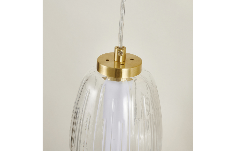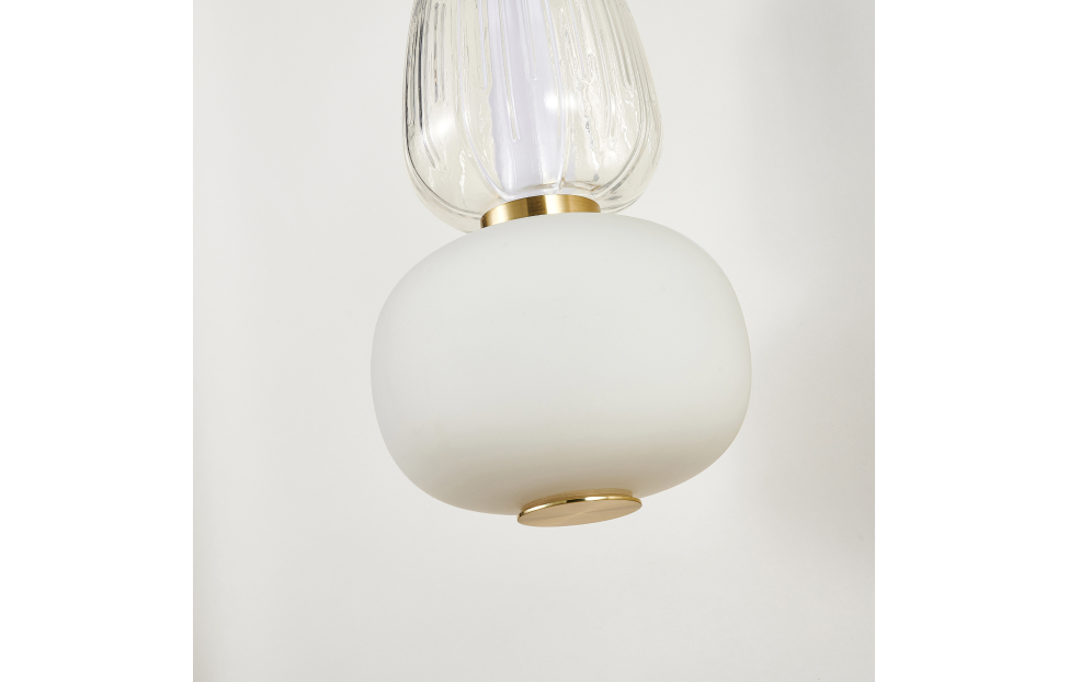 Чередование стеклянных плафонов разной формы, цвета и рисунка, а также цветовое решение каркаса в золоте создает насыщенный сложный и дорогой образ. Металлический каркас цвета золота, плафоны в виде бусин разнообразных форм из выдувного стекла двух видов - прозрачного и цвета опала.