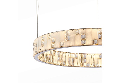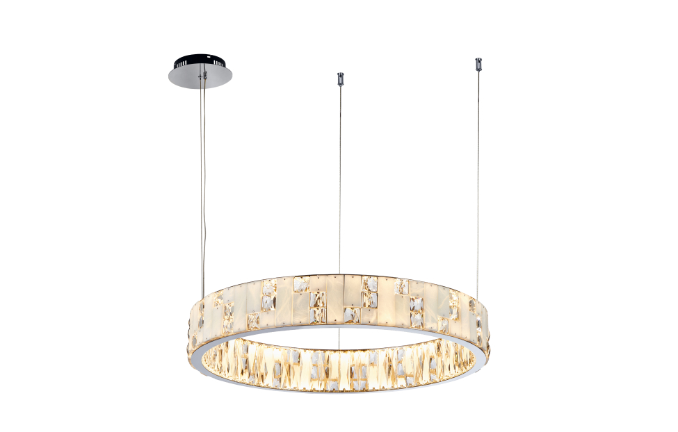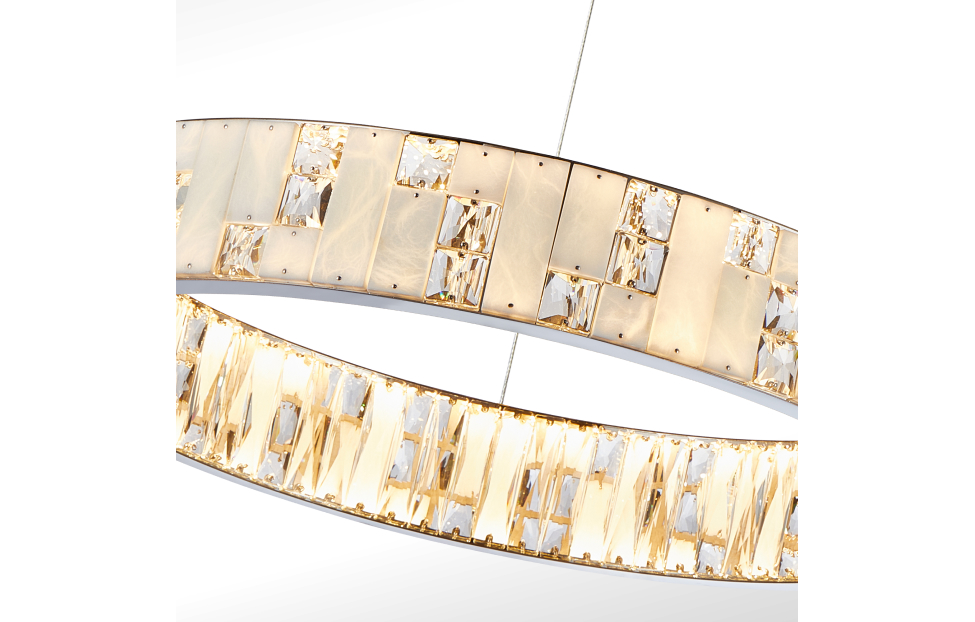 Конструкция люстр в виде колец на тросовых подвесах добавит в интерьер особый шарм и легкость. Хромированная отделка придает этим светильникам современный вид и отражает свет, создавая игру бликов и отражений. Декор в виде тонких пластин из белого мрамора придает изысканный и шикарный вид, особый блеск и нежность. Прозрачные вставки из хрусталя добавляют дополнительную яркость и контрастность. Люстры из этой коллекции создают изумительное освещение и станут прекрасным украшением вашего интерьера. Они идеально впишутся в современный дизайн гостиной, столовой или спальни.