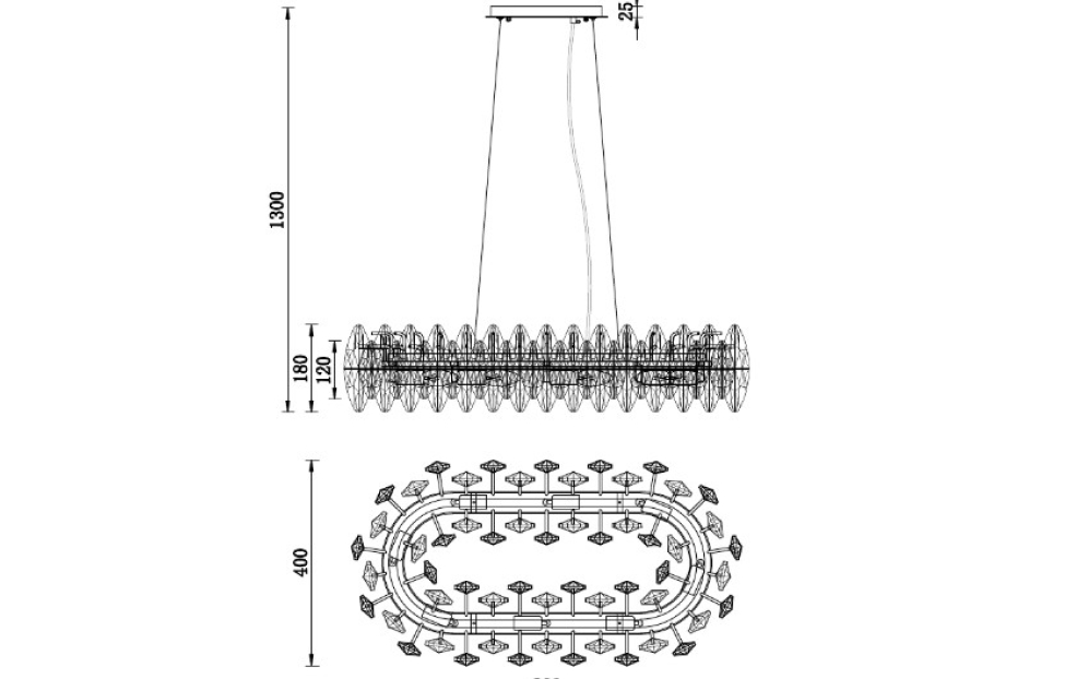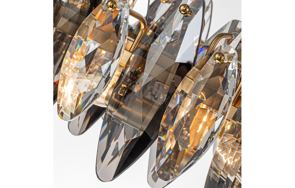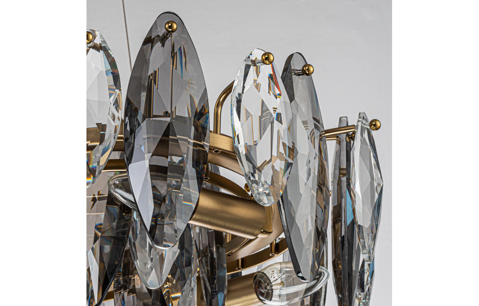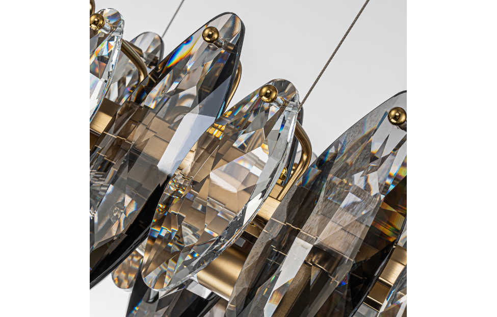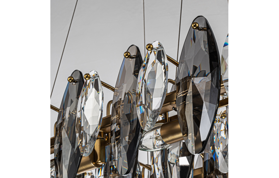 Glans – элегантная кольцевая коллекция, в которой используется прозрачный и серебристо-дымчатый хрусталь в ритмичном чередовании. Металлическая арматура светильника скрыта за хрустальными лепестками, создавая ощущение легкости и невесомости. К этой серии подходят универсальные крепления с помощью которых можно создать кольцевые композиции из нескольких люстр. Подвесная кольцевая люстра длиной 80 см, каркас в бронзовом цвете, лепестки прозрачного и дымчато-серого хрусталя разного размера, регулируемая высота.