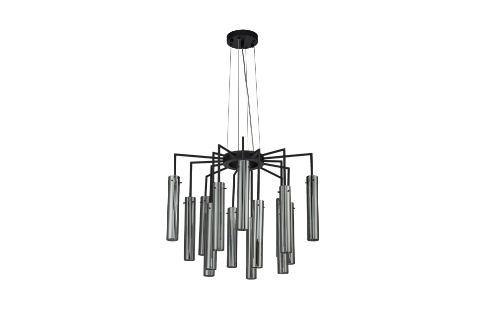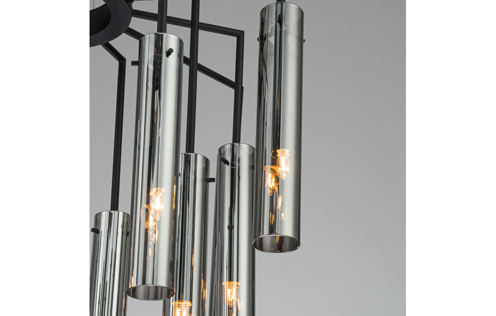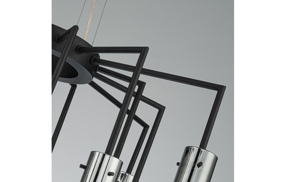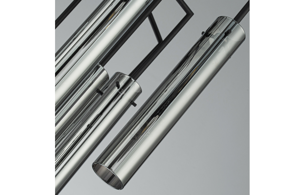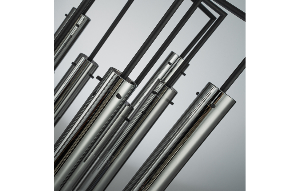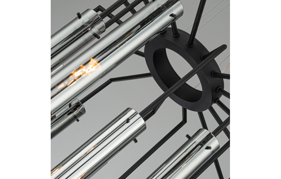 Каскадная люстра Orgel, каркас черного цвета, состоит из металлических трубок, изогнутых от центрального кольца под прямым углом, на конце каждой трубки расположен тонкий длинный плафон из стекла дымчато-серого цвета, сменная лампа G9, регулируемая высота.