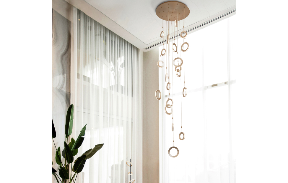 Коллекция Jongleur демонстрирует искусство баланса и динамики, где каждый элемент словно находится в постоянном движении. В качестве плафонов использованы объемные кольца цвета матовой латуни, которые светятся по периметру с помощью встроенной LED-ленты. Они закреплены под разным углом к тонкому черному каркасу светильника, будто вращаются вокруг основания, словно цирковые обручи хула-хуп. Регулируемая высота.