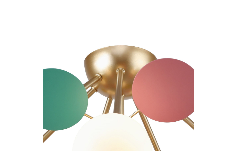 Multi Bliss поражает своим буйством красок и контрастом. Светильники из коллекции Multy Bliss чаще всего используют для детских комнат, чтобы создать уютную и игривую атмосферу. Декоративные круглые разноцветные пластины люстры и бра создают яркий и эффектный акцент в интерьере, придавая ему оригинальность и индивидуальность. Металлический каркас золотого цвета, круглые стеклянные плафоны молочного цвета, декоративные круглые разноцветные пластины, декоративные золотые шары, регулируемая высота.